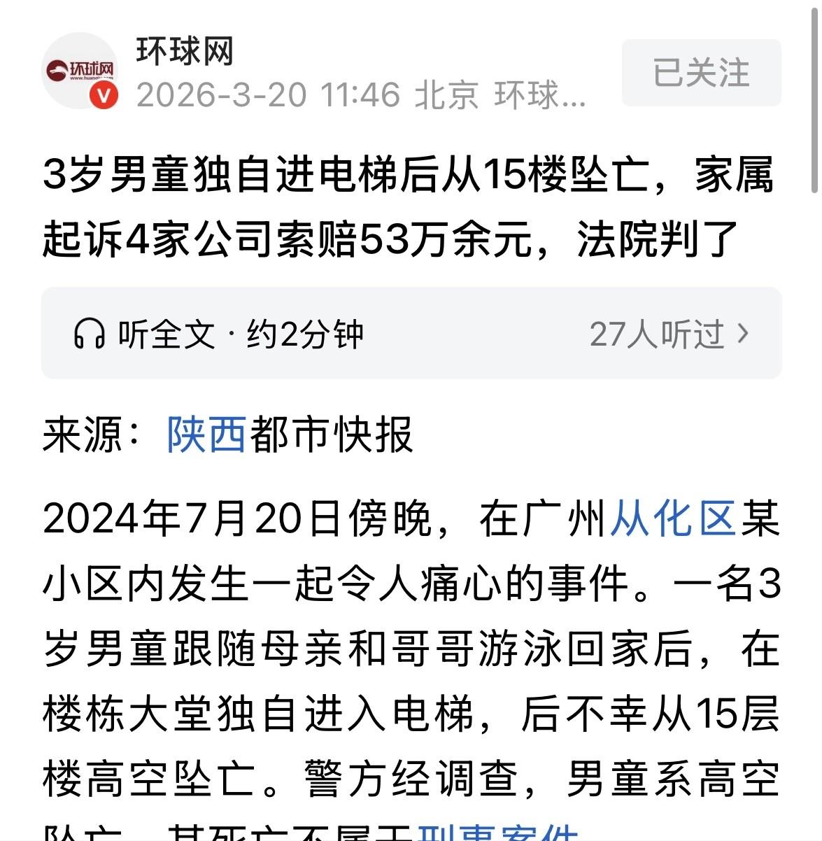 当妈的就在电梯口,眼睁睁看着门关上。就差那一步,3岁的孩子独自上了15楼,再见时已是冰冷的遗体。 53万的索赔单拍在法院桌上,物业、开发商、电梯公司全被告了。判决一出,所有人都倒吸一口凉气。 这事儿发生在广州从化。时间拨回2024年7月20日。沈某带着两个儿子刚游完泳。18点21分,大儿子按开电梯,3岁的小骆钻了进去。 当妈的跟在后头,不知怎么却退了一步。电梯门合上,直接把阴阳两隔。小骆一路升到15楼。监控里,他最后一次出现是18点25分。 孩子去哪了?踩着楼道的窗花护栏,掉下去了。当妈的慌了神,第一反应居然是发微信找物业管家。 等保安慢吞吞赶到大堂,再在二楼平台找到人,血已经流了一地。直到19点19分,沈某才拨打120。这中间耽误的时间,要命。 7月24日,公安局的调查结论出来了。高空坠亡,排除他杀,不属于刑事案件。孩子没了,家属悲痛欲绝。 转头就把责任全推了出去。物业没看好门,开发商栏杆没建好,电梯公司机器有问题。 总共索赔53万。这算盘打得响,就是想让别人买单。但广州中院的法官没“和稀泥”。 2026年3月18日,二审锤音落定。维持原判,驳回上诉。法院这“巴掌”,结结实实打在了父母脸上。 75%的主要责任,家属自己扛。《民法典》第26条和第34条写得明明白白,监护人不是摆设。 你不跟进电梯,你不看好孩子,出事了你连营救都慢半拍。这锅,你甩不掉。生命不是儿戏,监护权更不是空头支票。 物业也别想跑。判赔26万多,占了20%的责任。总公司还得承担补充清偿责任。为什么?因为你没看见。 15楼那护栏,小孩一踩就能翻过去。隐患摆在那多久了?你不仅不整改,连个突发事件应急方案都没有。 《民法典》第1198条的板子打得准。安全保障义务不是挂在墙上的口号。孩子丢了,保安10分钟才到,就派了俩人。 这叫服务?事发后响应迟缓,错失最佳救助时间,这20%的责任你背得一点不冤。 开发商同样挨了板子,掏6万多,占5%。别拿“验收合格”当免死金牌。原《民用建筑设计通则》规定得清楚,护栏不能有攀爬隐患。你中间加窗花,看着挺美,在小孩眼里那就是个“隐形梯子”。 设计缺陷就是缺陷。程序合规掩盖不了实质的致命危险。现场那清清楚楚的踩踏痕迹,就是铁证。法院这判决,直接撕破了开发商试图免责的遮羞布。 至于电梯公司,法院直接判了0责任。没证据证明电梯坏了,家属硬拉人下水这招行不通。一码归一码,谁的错谁认。 这判决够硬气。没有“死者为大”的无底线妥协。法院的逻辑很简单—过错决定责任。你当妈的失职是主因,但管理方的“隐形杀手”也脱不了干系。 法律在倒逼那些管理者:别光拿钱不干活,主动排险才是你的本职。 这事儿给所有小区敲了警钟。对成年人安全的设施,对孩子可能就是催命符。公共设施必须有“儿童视角”。 你以为的装饰,是他们攀爬的垫脚石。这血的教训,太惨痛。 赢了官司又怎样?拿到32万赔偿又怎样?那个2020年出生的小生命,永远留在了3岁。法律能分清责任,却换不回一条鲜活的命。这不仅是判决,更是给所有父母的一记重锤。