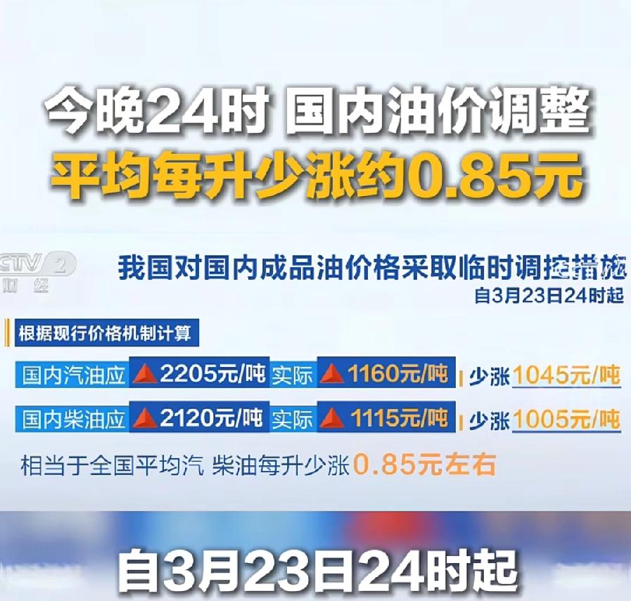 油价要暴涨,国家出手了!国家发改委13年来,第一次临时调控油价!少涨了一半,92号汽油不会进入9元时代,原来说涨1.6多,现在大约涨0.85元,一箱油少涨了约4、50元!少涨的钱谁出?国家补贴或者三桶油倒贴!央企、国企为人民,稳经济保民生是第一位,赚钱才是第二位!关键时刻,国家宏观调控敢于,这就是社会主义制度的优越性!