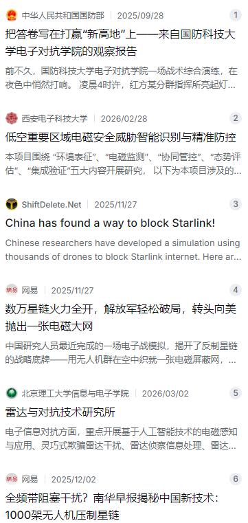 美国和日本要慌了!中国的“一张网”正在让美日变聋变瞎。而中国正在研究新型战术,就是通过无人机编制成一张“大网”,笼罩在小岛20公里的高空,以此形成一个超大的电磁屏障,这样信号是进不来也出不去。就连美国心心念念的卫星,也不能看透“大网”之下发生了什么。   麻烦看官老爷们右上角点击一下“关注”,既方便您进行讨论和分享,又能给您带来不一样的参与感,感谢您的支持!   说起现在的战争,早就不是以前那种飞机大炮对轰的模式了。真正决定胜负的,往往是你看不见摸不着的东西——信息。谁能把信号攥在手里,谁就能在战场上占得先机。美国人这些年一直在琢磨这个,搞了个“星链”,几万颗卫星在天上铺开,号称要让地球任何一个角落都断不了网。这玩意儿在俄乌战场上确实露了一手,乌克兰靠着它通信、指挥无人机,给俄军造成了不小的麻烦。可咱们中国人讲究的是“你有你的张良计,我有我的过墙梯”,你卫星再多,信号不还得从天上往地下传吗?只要在中间给你截了,你不就瞎了聋了?最近,咱们国内顶尖高校联合搞出来的一套新战术,瞄准的就是这个命门。   这个战术说白了,就是在20公里高的平流层,用上千架无人机编织一张巨大的电磁干扰网。注意,这个高度选得特别讲究。20公里是什么概念?一般的防空导弹够不着,比如美军常用的NASAMS系统,最大射高也就刚刚摸到边,想打下来难度极大。这地方还在咱们主权领空范围内,不存在什么国际争议。更重要的是,这个高度处于平流层底部,气流相对平稳,无人机和气球能长时间悬停。这就等于是在对手头顶上,在星链卫星和地面终端之间,凭空砌了一道无形的墙。   这个技术可不是凭空想出来的。根据香港《南华早报》的披露,浙江大学和北京理工大学的研究团队已经做了详细的模拟推演。他们发现,要想覆盖像咱们东南某大型岛屿这样的区域,大概需要出动一千到两千架携带干扰设备的无人机。这些无人机不是乱糟糟的一团,而是通过智能算法编队飞行,像蜂群一样协同作战,每架负责一块区域,最后拼接成一个无缝的电磁屏障。它们上面挂着特制的干扰器,专门盯着星链使用的Ku和Ka频段,这种针对性干扰效率极高,不是那种“杀敌一千自损八百”的大功率无差别覆盖。   这招的精妙之处在于“非对称”三个字。你美国人搞“星链”,那是高科技、高投入,卫星贵得离谱。而我们应对的手段,是大量的、相对廉价的无人机。就算你打下来几架,对我整个网络来说无关痛痒,我随时可以补上。这就好像你用昂贵的跑车,我用共享单车堵路,你技术再先进,也架不住我量大管饱。这种低成本消耗高技术的方式,让美国人非常头疼。美国智库兰德公司的一份报告也不得不承认,中国在电磁战领域的能力,正在让西太平洋变成“美国的战略泥潭”。   这种战术一旦实用化,对依赖“星链”的美军和日本自卫队来说,几乎是毁灭性的打击。你想啊,如果美军在冲绳的基地或者航母编队突然失去了卫星信号,无人机飞不起来,导弹找不到目标,指挥系统乱成一锅粥,那仗还怎么打?2025年的一次美日联合军演中,当解放军模拟这种电子干扰时,驻日美军的F-35战机一度与指挥中心失联,演习被迫中断。这说明咱们的设想,已经给对手造成了实实在在的心理压力和现实威胁。   当然,咱们搞这个不是为了去侵略谁,而是为了更好地保护自己。中国一直坚持的是防御性的国防政策。我们有大量的海岸线和广阔的国土需要守护,面对外部势力拿着“星链”这样的东西来挑衅,我们总不能赤手空拳吧?这套系统就像是一个巨大的电磁盾牌,平时看不出动静,一旦有人想把触角伸进来,这张网就能让它瞬间变成“瞎子”和“聋子”。这种能力,本身就是一种强大的威慑,让对手在挑衅之前,不得不掂量掂量后果。   技术上的可行性,背后是咱们国家多年来在多个领域的深厚积累。像北京理工大学在雷达与对抗技术方面就有很深的研究底蕴,他们的团队重点攻关的就是电子信息对抗和人工智能感知。而西安电子科技大学李赞教授的团队,更是专门研究重要区域电磁安全的,他们搞出来的一体化防控系统,能实现从电磁监测到精准封控的闭环管理。这些高校和科研院所的突破,不是一天两天的事,而是多年默默耕耘的结果。就像国防科技大学电子对抗学院那样,他们的科研和教学,始终紧盯着战场最前沿,把论文写在打赢“新高地”上。   有人可能会担心,这个计划是不是太理想化了?毕竟要把一两千架无人机同时放在天上,还要长时间工作,能源和后勤怎么解决?这一点咱们也想到了。这些高空平台大多采用太阳能供电,白天充电,晚上用蓄电池,理论上可以连续工作几个月。而且除了无人机,还可以混合部署高空气球,这东西滞空时间更长,能起到很好的补充作用。这种“高低搭配、远近结合”的部署方式,既保证了灵活性,又大大降低了维护成本。