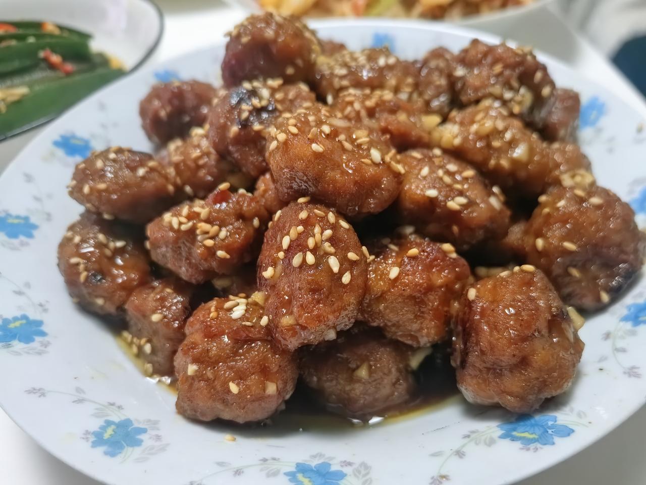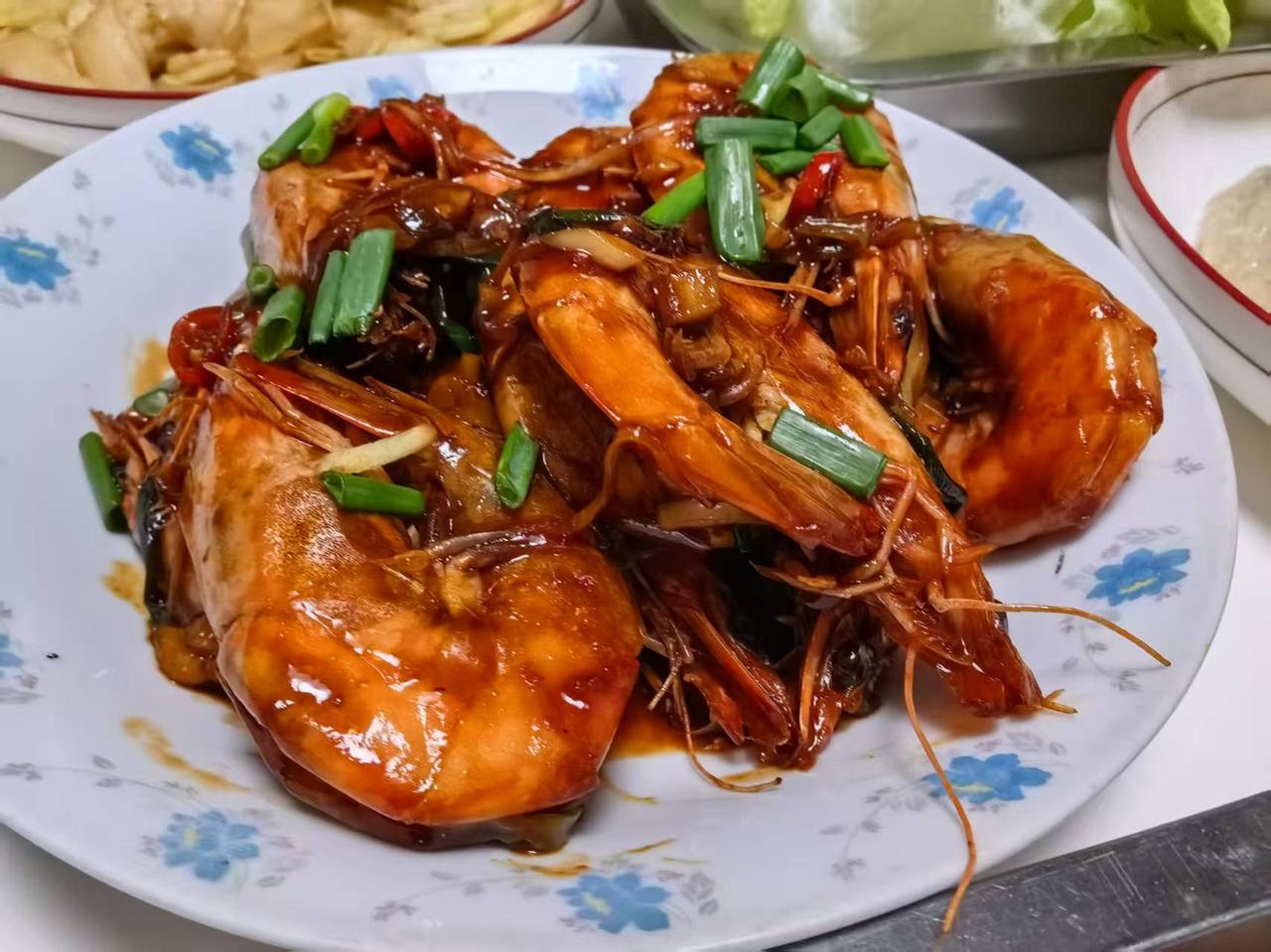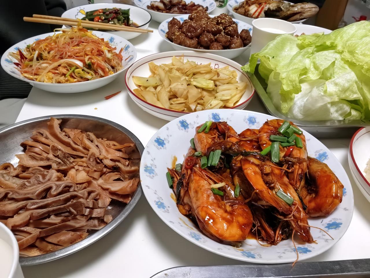 初一,可算轮到我上场了。做的都是小李和小黄爱吃的家常饭,糖醋丸子,油焖大虾,凉拌下酒菜,我最拿手的!