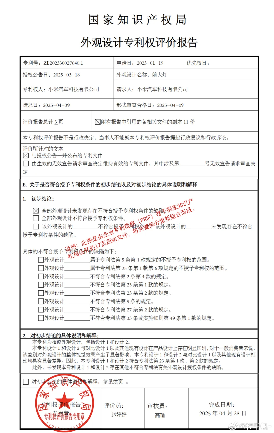 更有意思的是国家知识产权在2025年5月7日发布了经过审查后的《外观设计专利权评价报告》,评价报告确认了小米汽车这件外观专利的有效性。