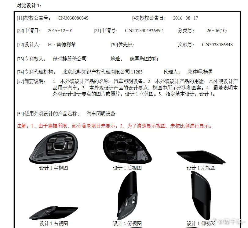 在所引证的现有技术中,专利审查员对比了保时捷、奥迪、日产、丰田和长安汽车等车灯的外观专利设计,认为小米汽车的外观专利具有新颖性和创造性。