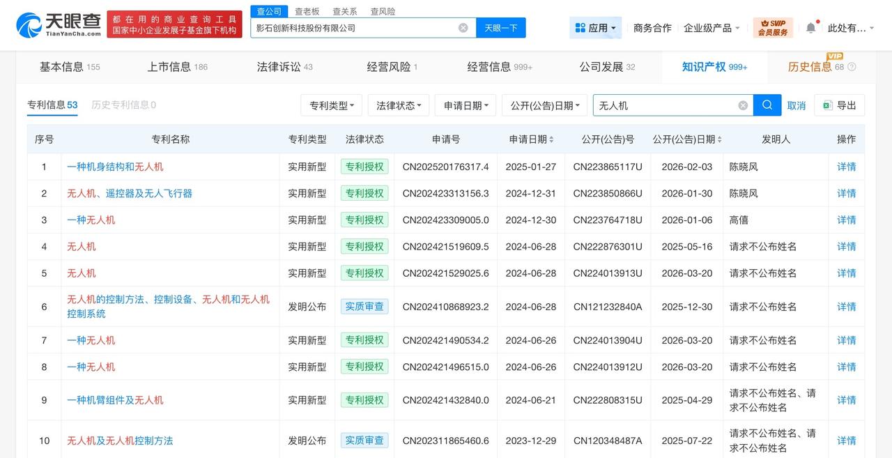 揭秘影石创新关联公司 影石创新多项无人机专利已获授权大疆起诉影石创新 据媒体报道,近日,深圳市大疆创新科技有限公司正式起诉影石创新,涉及6项专利权属纠纷,目前,法院已正式立案。 天眼查App显示,影石创新关联公司影石创新科技股份有限公司成立于2015年7月,法定代表人为刘靖康,注册资本4.01亿人民币,经营范围含网络技术研发,计算机软硬件的技术开发、销售,经营进出口业务,计算机软硬件及外围设备制造,电子产品销售,金银制品销售等。股东信息显示,该公司由北京岚锋创视网络科技有限公司、迅雷网络技术有限公司、厦门富凯创业投资合伙企业(有限合伙)等共同持股。知识产权信息显示,该公司多项无人机相关专利已获授权,包括“无人机、遥控器及无人飞行器”“一种机身结构和无人机”等,其中,部分专利发明人被记载为“请求不公布姓名”。 天眼查信息: