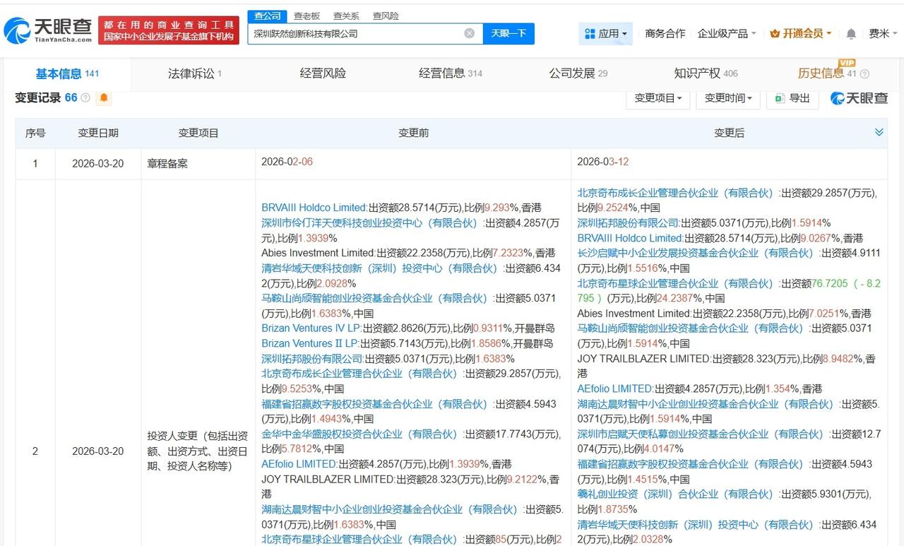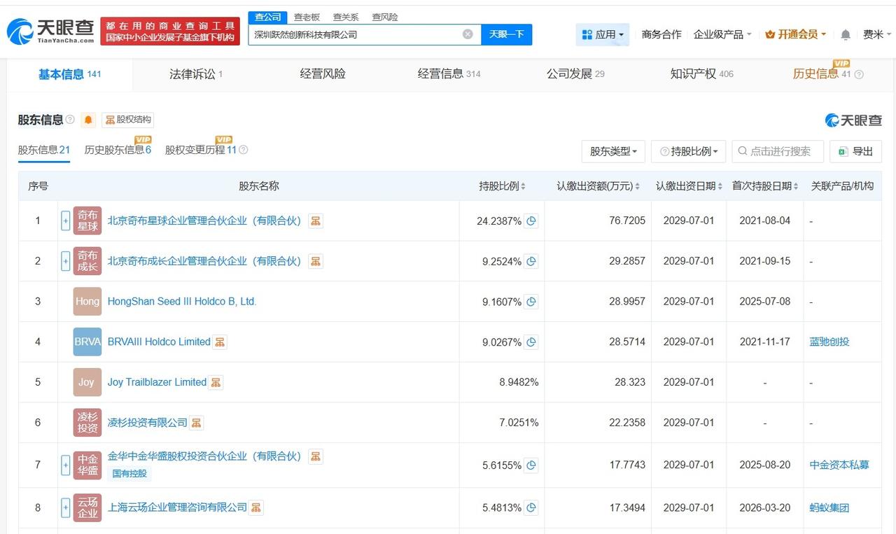 蚂蚁集团旗下公司入股AI玩具生产商跃然创新 天眼查App显示,近日,深圳跃然创新科技有限公司发生工商变更,新增蚂蚁集团旗下上海云玚企业管理咨询有限公司为股东,同时,注册资本由约307.5万人民币增至约316.5万人民币。 深圳跃然创新科技有限公司成立于2021年8月,法定代表人为李勇,经营范围含玩具销售、软件开发、移动终端设备制造等。股东信息显示,该公司现由北京奇布星球企业管理合伙企业(有限合伙)、北京奇布成长企业管理合伙企业(有限合伙)及上述新增股东等共同持股。官网显示,该公司是一家致力于打造全新游戏体验的玩具公司。 天眼查信息: