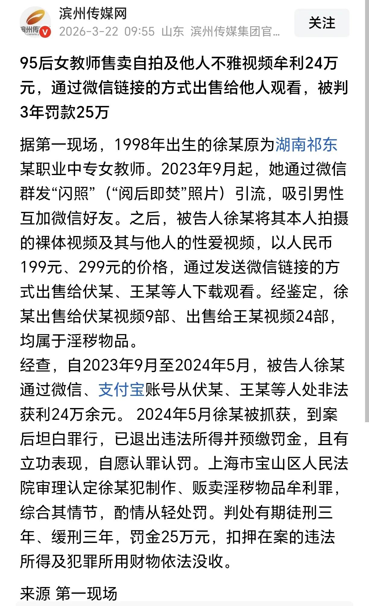 湖南祁东县女教师徐某火了,今天在在网上被各路新闻报道和自媒体发图评论。 看评论区,有批评的、有理解的……各种声音纷纷扰扰。评论中最让人印象深刻的就是以下两种言论: 1、以徐老师的身材颜值,去网上当擦边女主播,靠榜一大哥和粉丝礼物,两年下来挣得都不止新闻里非法获利的这个数。 2、凭她的条件,本可以当情感骗子,多收几次彩礼和养🐟,平时接受供养,拿了钱再果断分手,即使法院都难追回来,结果却走了收益最低的路。 类似“她本可以剥削他人合法挣钱,却因为太有良心而选择非法剥削自己”的惋惜言论在新闻评论区层出不穷,都是为她可惜的。可见网友们在经历众多网络毁三观事件后,对这类行为的宽容度是很高的。 只能说要尊重法律判决,也要看到事件引起热议背后的原因。 祁东事件