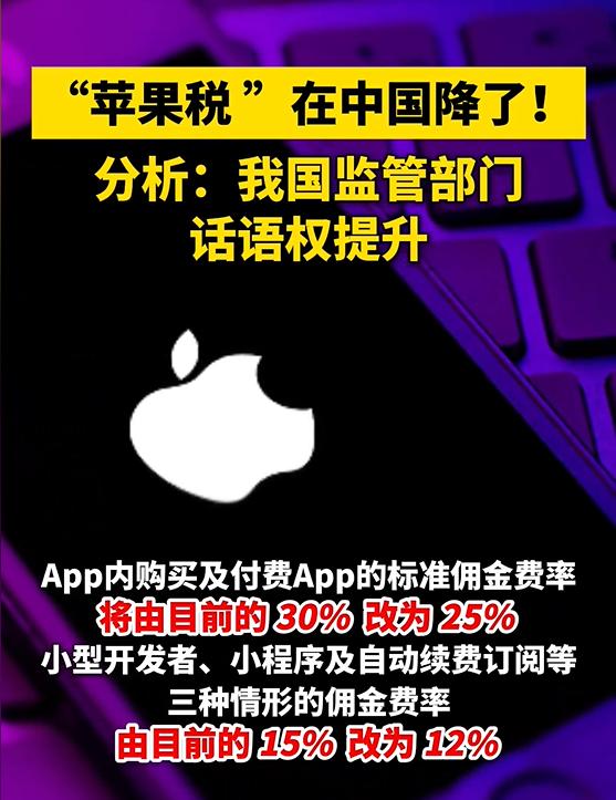 一年少给60多亿!苹果税在中国,降了! 经中国监管部门与苹果公司沟通,3月15日起,中国市场苹果税正式下调:标准佣金从30%降至25%,小型企业及特定业务从15%降至12%。要知道包括美国在内的全球绝大多数国家仍维持30%,而小型企业费率我们比日本整改后的15%还少了3个百分点。 这意味着,在App Store应用内购买核心支付场景中,中国已成为全球苹果税率最低的市场之一。相当于一年少拿60亿元! 或许很多人会说“两年”听起来不短,但对比全球,才能理解什么叫“中国效率”。 欧盟:从立法博弈到苹果调整,耗时3年多; 日本:立法加落地,共34个月; 韩国:法案通过已逾两年,降费仍步履维艰; 美国:Epic诉苹果案拉扯五年多,至今未果。 而在中国,从2024年3月苹果在欧盟降税引发国内关注,到2026年3月新规落地,正好两年。没有漫长立法博弈,没有焦灼的司法拉锯,中国走通了一条更务实的路:监管部门出面沟通,加上市场自身呼声,两股力量一起推,效果就出来了。 说到底,想来中国做生意,就得守这儿的规矩。在这两股力量的推动下,苹果最终表了态,承诺会保持“公平透明”,并且给了个“不高于其他市场”的承诺。人民日报都算了笔账,此次苹果降税,实质上能为我国500万开发者每年减少60多亿元的成本支出。但这省下的可能不只是钱,还有更宝贵的时间和机会。 通过努力,苹果对我们做出了“最惠国待遇”承诺,但仍有坚持,还未在中国开放外链支付和第三方应用分发渠道。但我相信在未来通过持持续监管和引导,会加快苹果在中国全面开放多元支付与分发渠道的脚步。 俗话说,世上本没有路,走的人多了,也便成了路。而中国监管和市场一起,不仅把这条难走的路给蹚出来了,还在短时间内看到了实在成果。这无疑给消费者及中国企业,在国际竞争中争取到了更多的权益、公平环境和宝贵的时间!