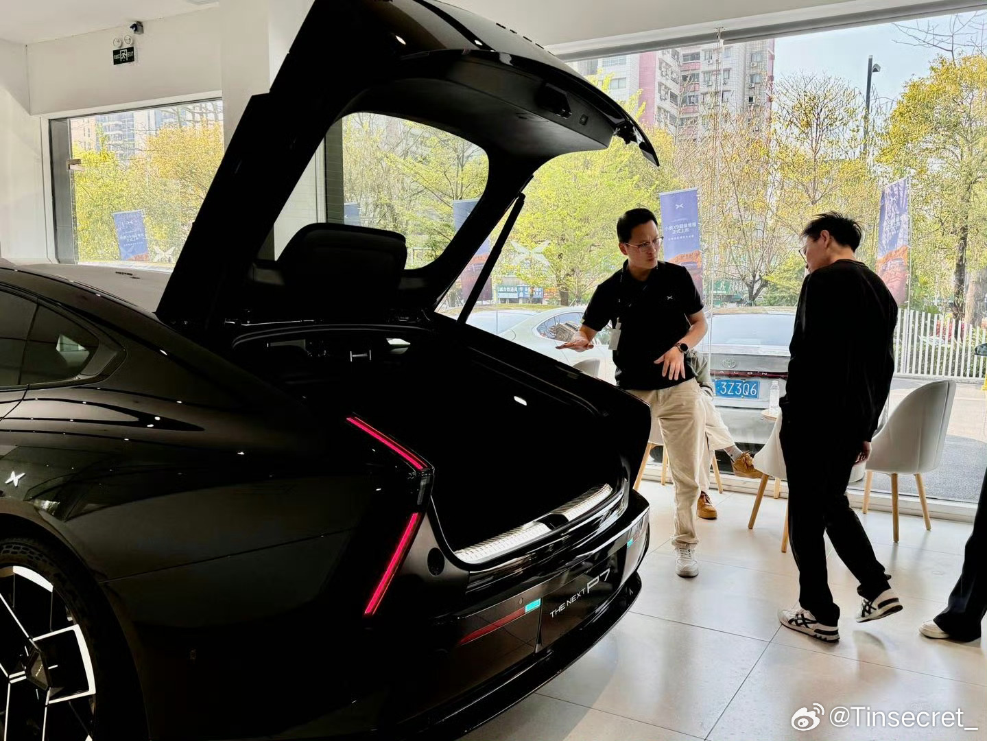 黑色是最能检验车身设计功底的颜色。很多车的黑色会吃掉线条,显得臃肿;但P7的暗夜黑配合黑化套件,让车身侧面的曲面像被风和水流自然打磨过的黑曜石,暗夜黑配合那个车身的线条,整体感特别强的,在店里展台灯光搭配确实出效果。