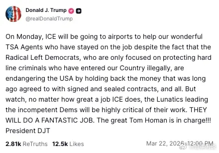 “周一,移民及海关执法局(ICE)将前往机场,协助我们优秀的运输安全管理局(TSA)特工。尽管激进的左翼民主党人一心只想保护非法入境的重刑犯,却扣留了早已签署合同并达成一致的资金,危及美国安全,但他们仍然坚守岗位。”特朗普在周日早晨的最新消息中说道。“但是,等着瞧吧,无论ICE的工作多么出色,那些领导无能民主党的疯子们都会对他们的工作大加挞伐。他们肯定会做得非常棒!伟大的汤姆·霍曼(Tom Homan)负责此事!!!”