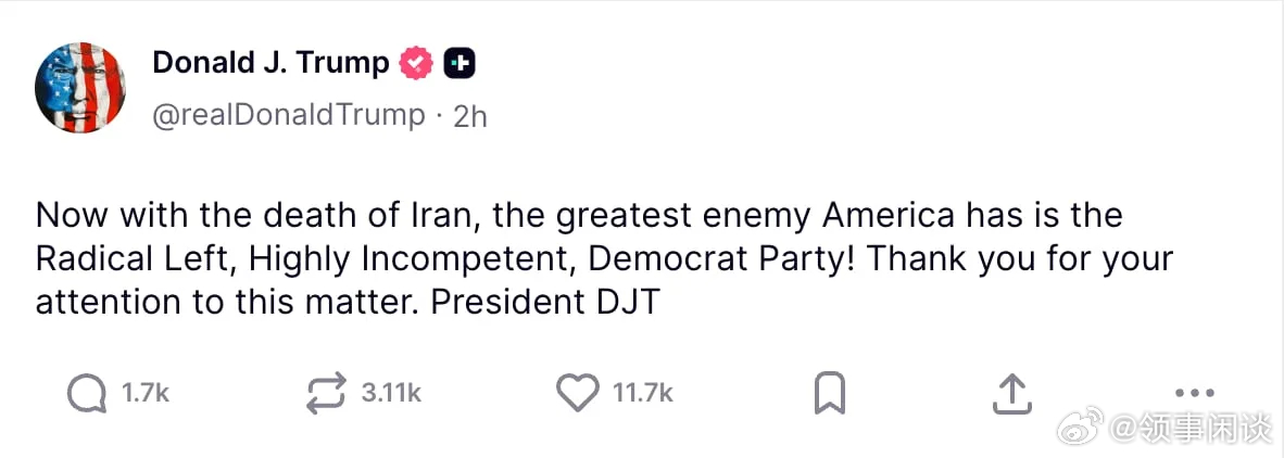 “如今伊朗覆灭,美国最大的敌人就是激进左翼、极其无能的民主党!”他写道。“感谢各位关注此事。”