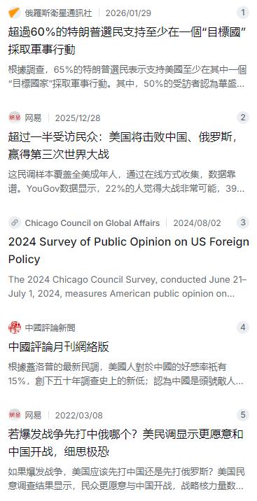 美媒调查:如果美国一定要与中国或者俄罗斯其中一个国家开战,你愿意选择哪个国家?结果显示:25%的受调查者选择与中国开战,5%的受调查者选择与俄罗斯开战   麻烦看官老爷们右上角点击一下“关注”,既方便您进行讨论和分享,又能给您带来不一样的参与感,感谢您的支持!   美国那边冒出个挺扎眼的民调结果,看得人心里一紧。有家权威媒体搞了个调查,给受访者出了道“送命题”:要是美国非得跟中国或者俄罗斯其中一个开战,你选谁?结果你猜怎么着?25%的人选了跟中国打,只有5%的人敢选俄罗斯。这数字差距也太大了,说实话,这背后反映出来的问题,比数字本身要严重得多。   咱们先捋捋这个调查。这可不是什么野鸡机构为了博眼球瞎编的,是正经媒体搞的,样本量也够大,两千多人呢。那为啥会出现这种一边倒的情况?难道是美国老百姓觉得中国好欺负,俄罗斯惹不起?话糙理不糙,还真有点这个意思。   你想啊,这些年美国的主流媒体和政客,天天在念叨啥?他们把俄罗斯塑造成一个手里攥着核大棒、动不动就掀桌子的“莽夫”形象。从俄乌冲突开始,俄罗斯那边时不时就亮亮核家底,普京也放过话,那意思很明白:别逼我,逼急了大家一块儿玩完。这种舆论轰炸了几年,美国老百姓心里头已经种下了个根深蒂固的念头——跟俄罗斯开战?那不就是找死吗?同归于尽的买卖谁干啊。   可轮到中国这边,画风就全变了。美国舆论的叙事里,好像总在有意无意地淡化中国的军事实力,特别是那些能一招制敌的“杀手锏”。他们整天嚷嚷中国威胁论,可一到真刀真枪的对比上,又给自家民众灌输一种“咱们比中国强多了”的错觉。很多美国老百姓就觉得,跟中国打,那可能就是个常规冲突,美国赢面大。这种认知偏差,说白了就是被舆论带偏了,压根没意识到中国维护国家利益的决心有多硬,也没看到咱们这些年国防现代化建设实实在在的成果。   这里头的水可深了。美国那帮军工复合体和政治精英,其实挺乐意看到这种“认知偏差”一直存在下去的。为啥?你想啊,要大家都觉得跟中国开战没啥大不了的,那政府批军费的时候是不是就更痛快了?政客们转移国内矛盾的时候,是不是就多了一张牌可打?这种民调结果,某种程度上就是他们操控信息、愚弄百姓的“成绩单”。老百姓稀里糊涂地成了他们博弈的棋子,还以为自己是在爱国呢。   美国前驻华大使伯恩斯前不久都说了,美国实际上低估了中国的军事实力和科技实力。他亲眼见过解放军,知道咱们不是吃素的。可问题是,这种理性的声音,在美国的舆论场上能传多远?大多数老百姓听到的,还是那些为了流量和利益刻意扭曲的信息。他们被困在自己那个“信息茧房”里,出不来了。   还有一点特别值得玩味。同样是打仗,美国人心里那杆秤也是歪的。有些调查显示,超过六成的美国人觉得未来十年内会爆发世界大战,可真要问他们愿不愿意上战场,愿意的人少得可怜。这就叫“死道友不死贫道”,嘴上喊打喊杀挺来劲,真让自己去送命?门儿都没有。这种社会情绪一旦被利用,国家就很容易被那些不负责任的政客裹挟着,一步步滑向冲突的深渊。   所以你看,这25%对5%的民调,根本不是简单的数字游戏。它是一面镜子,照出了美国社会对中俄认知的严重扭曲,也照出了其内部政治操弄的丑陋。如果美国社会不能打破这种信息壁垒,不能纠正对中俄军力和战略底线的傲慢与偏见,那这种建立在沙堆上的民意,早晚有一天会把整个国家带进沟里。到那时候,再想回头可就难了。
