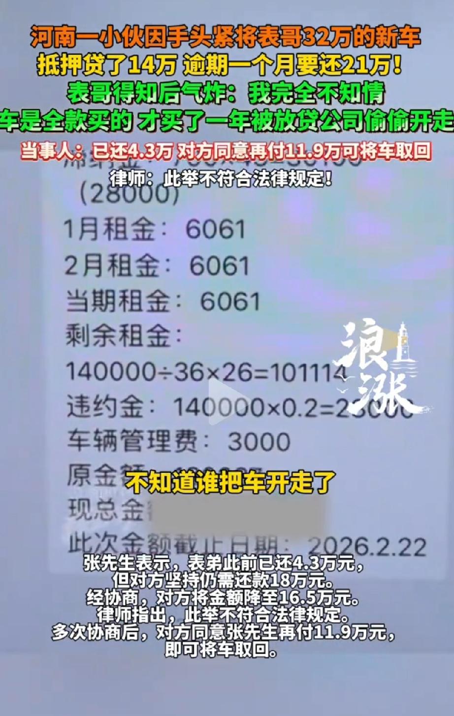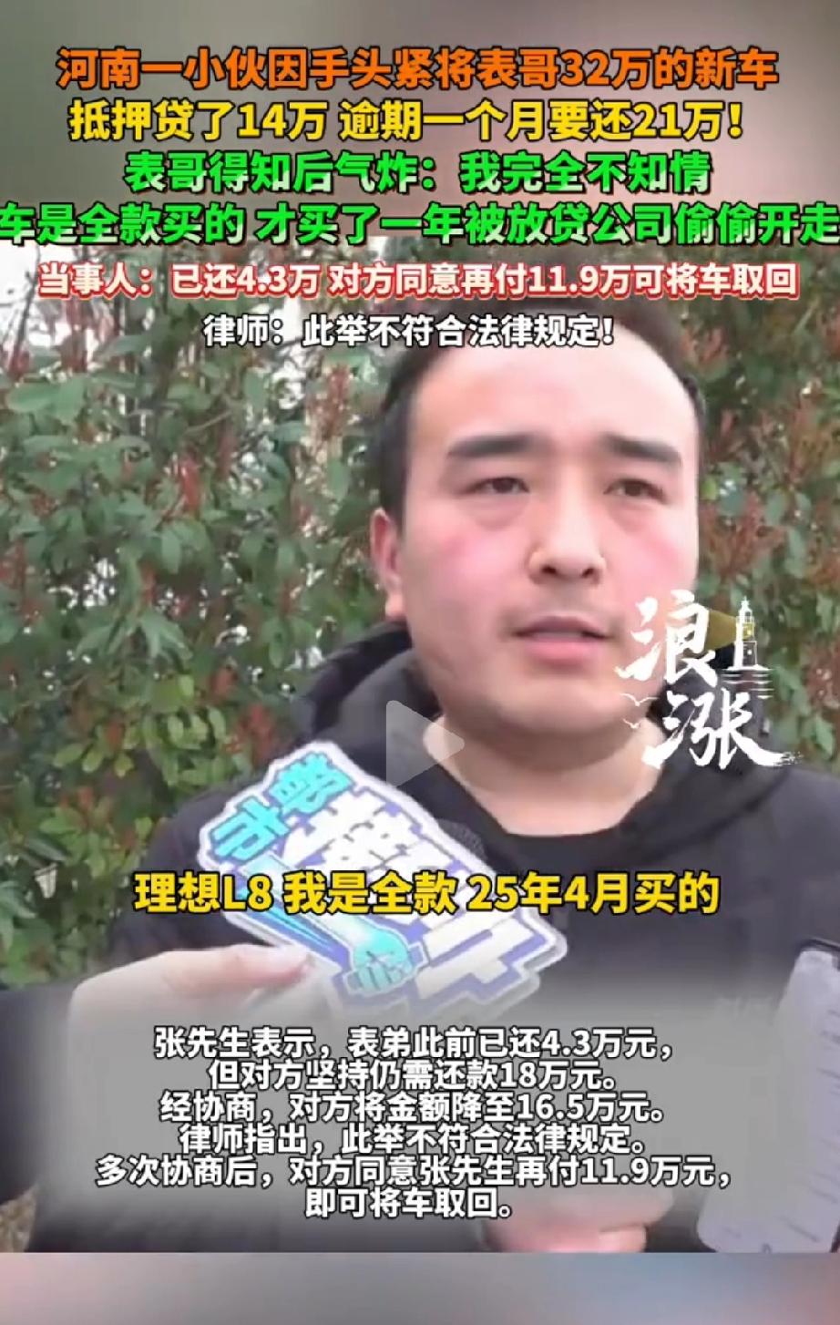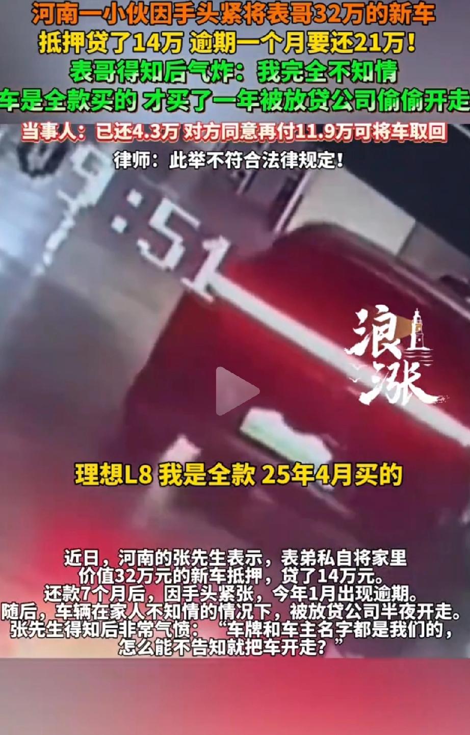 气炸了!河南,张先生全款32万买的理想L8刚开不久,大年初五深夜车被放贷公司悄悄拖走,万万没有想到竟是表弟拿去抵押了14万,张口就要21万赎车。律师:此举不符合法律规定! 河南张先生家买了辆理想L8新车,价值32万,是全款买的。 没想到表弟趁家人不知道,偷偷把车抵押给了河南省嘉航金融服务有限公司,贷了14万。 表弟还了7个月,一共还了4.3万,之后就逾期没还。 2026年农历大年初五深夜,放贷公司没通知车主,直接把车拖走了。 对方一开始要21万才能赎车,协商后降到16.5万,最后张先生再付11.9万,才把车取回来。 这件事怎么看怎么憋屈。表弟私下把别人名下的车拿去抵押,本身就站不住脚,但更离谱的是这个放贷公司的操作。咱一项一项说。 先说利息,合同上算下来实际年化利率高达32.8%,这是什么概念?国家保护的上限是同期LPR的四倍,现在LPR才3.95%左右,四倍也就15%出头,你直接翻了一倍还多,这不是高利贷是什么? 再说合同,里面有一条“逾期可拖车”的条款,说白了就是霸王条款。车子又不是你的,你凭什么说拖就拖?还是半夜偷偷拖走,这跟偷有什么区别? 过去类似案子法院都判过,这种融资租赁合同压根不合法。 最后说拖车这事儿本身,法律上这叫非法侵占。就算对方觉得表弟违约了,那也得走法律程序,不能自己上手抢车。你半夜三更把人家车弄走,这叫哪门子的合法催收? 有网友气得不行:“家里32万的车,你说抵押就抵押?这是拿家人当大冤种啊!” 咱说句公道话,表弟这事儿做得确实不像话,家里人辛辛苦苦买的车,你拿去换钱自己花,出了事还得家人帮你擦屁股,这叫什么事儿? 更有网友一针见血:“大年初五拖车,这公司是真会挑日子,摆明了就是掐着你们过节放松警惕,好下手。” 你想想,大过年的,一家人正高兴呢,车没了,搁谁身上不窝火? 张先生最后被逼得掏11.9万去赎车,说白了就是花钱消灾。可凭什么?明明是表弟借的钱,明明是高利贷在搞鬼,最后买单的却是最无辜的家人。 这公平吗?这合理吗?咱老百姓买个车容易吗?又不是大风刮来的,凭什么被这么欺负? 借贷这事儿,真不是闹着玩的,尤其年轻人,别觉得自己能扛得住,高利贷的坑一旦踩进去,想爬出来太难了。 家里的大额财产,车子房子什么的,一定要有明确的管理意识,不能让谁都能随便拿去处置。 遇到这种事,千万别慌,对方再凶,也得按法律来,半夜拖车这事儿,搁哪儿都说不过去。