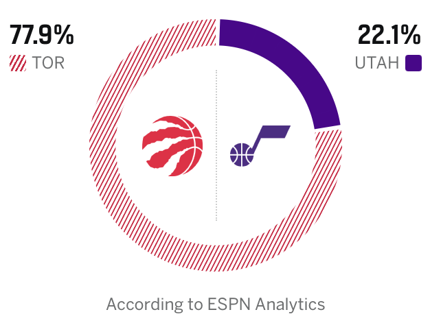 ESPN预测猛龙vs爵士:猛龙胜率77.9%,爵士胜率22.1%