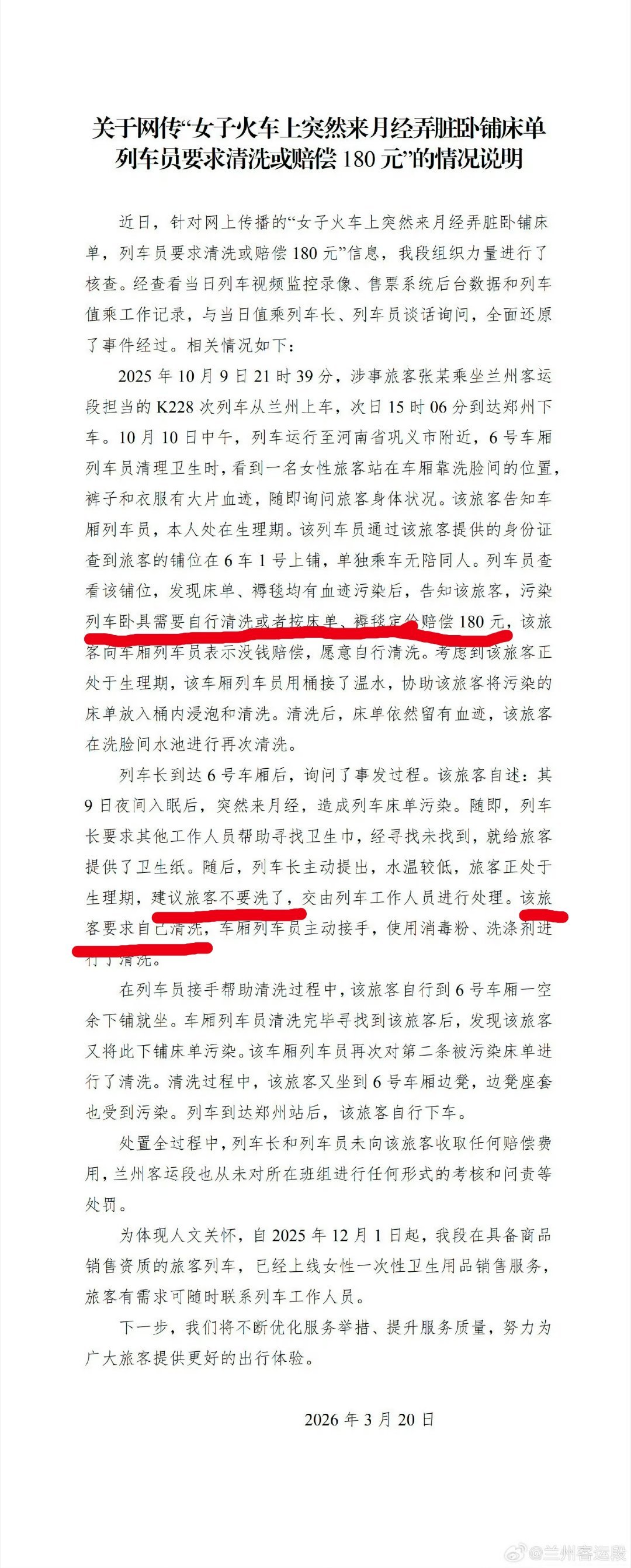 就像我前几天说的,这件事乘客(我们现在知道她在起号)角度是呼吁火车上售卖卫生巾,卫生巾也是必需品。然后这趟列车接受她的意见也开始卖了(其实几年前就开始卖了)。理论上问题已经解决了。