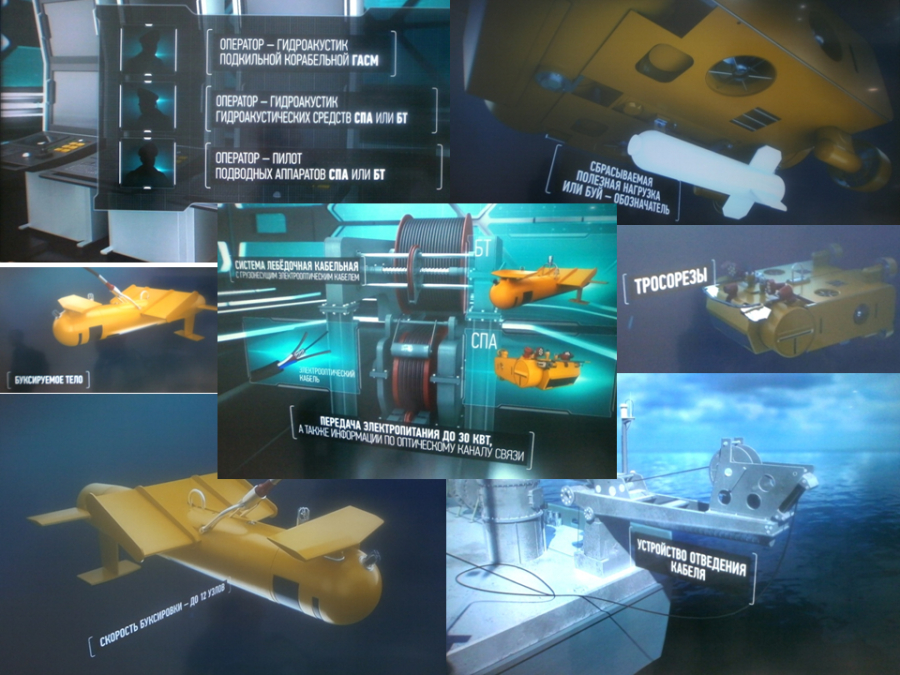 12700型的后续批次(第二和第三批次)则采用了俄罗斯国产的第四代“亚历山德里特-ISPUM”反水雷系统。该系统吸收了法国反水雷无人艇的设计和经验,由水下自主航行器、拖曳式航行器、软硬件综合控制系统、电缆绞车系统及专用电源子系统等组成,并集成了包含三个独立的声呐通道及低频探雷工作模式多频声呐系统。