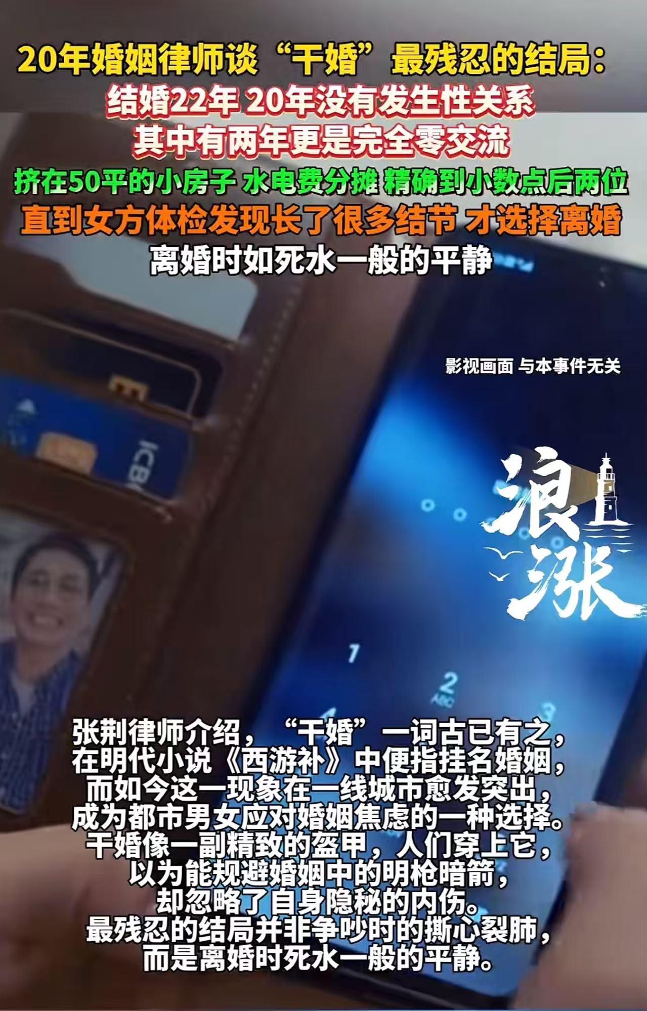 奇葩!夫妻结婚22年20年无性生活,甚至其中有两年完全无交流,却同住50㎡小房子里,两人连水电费都分得清清楚楚!网友:“都没有欲望么?也真是不是一家人,不进一家门!” 老张是个干了快20年的婚姻律师,经手的离婚案子没有一千也有八百。可最近他接到的这个案子,让他坐在办公室里,对着卷宗发了好久的呆,最后只长叹一口气:“干了半辈子,没见过这么‘精致’的冷漠。” 故事的主角是一对结婚22年的夫妻。 外人看他们,挺正常。住在市中心一套50平米的小两居里。可只有关起门来,才知道这屋里冷得像冰窖。 整整20年啊!这对夫妻没有过一次性生活。甚至在最严重的两年里,两人住在同一个屋檐下,抬头不见低头见,却愣是没说过一句话。 丈夫看电视,妻子回房间;妻子做饭,丈夫吃完默默洗碗,全程零交流。空气里弥漫的不是烟火气,而是令人窒息的尴尬和疏离。 最让人大跌眼镜的,是他们的“经济独立”。 都说夫妻是一家人,不分你我。可这两人,分得那叫一个清清楚楚,简直到了病态的地步。 每个月的水电费单子来了,丈夫会拿着计算器,噼里啪啦一顿按。 比如这个月电费是32.57元。 丈夫会把纸条压在茶几上,上面写着:“应付16.29元”。 妻子看到后,会把钱转给丈夫。哪怕是一分钱对不上,谁也不肯多掏! 这种“精确到小数点后两位”的算计,持续了十几年。 在这个50平米的空间里,他们不像夫妻,倒像是两个被迫合租、互相提防的陌生租客。 日子就这么一天天熬着。 妻子是个传统女人,为了孩子,为了面子,硬是把这口苦水咽了20年。 可身体是最诚实的。长期压抑、抑郁、无人倾诉,让她的身体彻底亮了红灯。 去年体检,她被查出了严重的甲状腺结节,医生警告说,再这么下去,后果不堪设想。 那一刻,看着镜子里憔悴的自己,想着这20年如行尸走肉般的生活,她突然醒了。 “去他的面子,去他的凑合!我要活命!” 她找到了老张,坚决要离婚。 当老张问起为什么能忍这么久时,妻子苦笑:“以前觉得为了面子忍忍就过去了,现在才发现,这种‘干婚’不是在保全家庭,是在慢性自杀。” 【网友热议】 “我的天,20年无性?还能在一个屋里待着?换我一天都受不了!这哪是夫妻,简直是仇人浪费青春啊,早离早解脱!” “这样过半年就好分了,还忍了20年,浪费青春!” “因为身边的小社会要求你必须有婚姻,没有婚姻会不停给你介绍,把你当资源使用!” “都是必须要拖垮对方的主,最后到死才发现自己错的离谱!” 老一辈离婚率低,不是感情好,是哪怕像这样凑合过一辈子,也不敢离。现在的年轻人一言不合就离,虽然冲动,但至少不愿在这种死水里淹死。” 【观点与看法】 这种“精确计算”的婚姻,是对人性最大的讽刺。 连32.57元的电费都要算到小数点后两位,这算的是什么? 算的不是钱,是心寒! 当夫妻之间开始像防贼一样防着对方,每一分付出都要计较回报,每一丝温情都要权衡利弊时,这段关系其实早就死了。 所谓的“搭伙过日子”,如果只剩下了“搭伙”而没有“日子”,那还不如去住养老院,至少那里还有护工的笑脸。 这种冷漠比争吵更可怕,争吵说明还在乎,而这种死寂,说明心已经彻底枯死了。 你所谓的“完整家庭”,其实是一个充满毒素的培养皿。及时止损,不是自私,是对自己生命最大的负责! 人生短短几十年,与其在一段名存实亡的婚姻里互相消耗,不如痛快地放手,给自己一个重生的机会。 最后,送给所有正在“干婚”中挣扎的人一句话:婚姻是为了让两个人活得更好,而不是为了证明“我没离婚”。 如果你的婚姻让你生病、让你窒息、让你连笑都不会了,那就勇敢地剪断这根烂绳子吧! 记住,你的生命只有一次,别让它终结在冰冷的算计和无休止的沉默里!宁可高傲地单身,也不要卑微地凑合!