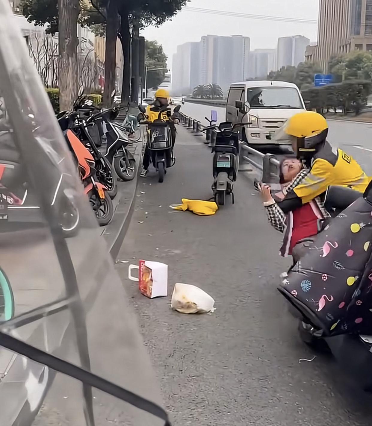 小哥有可能摊上大事! 近日,一名外卖小哥送餐时在人行道逆行,车上装外卖的箱子刮蹭了一名大姐,而此时的外卖员全然不知,继续加油往前跑。 这时女的伸手想去拦没拦住,手打到了外卖箱,箱子里的外卖掉了下来,这举动一下激怒了他外卖小哥。只见他停好车后,一把抱住大姐,顺势把她放倒在地。能看得出,小哥已经尽力不让自己冲动,如果放倒在地再补上一脚或一拳,那么,外卖小哥真的是吃不了 兜着走了。 不管怎样,你人行道逆行,有错在先,不知道外卖小哥和大姐在沟通过程中,有没有沟通明白,还是大姐什么话激怒了小哥,那就不得而知。说句不爱听的话,现在的尽量别去招惹任何一个人,说不定你的一句话或者一个举动,就是压倒对方的最后一根稻草,让人做出丧失理智的决定。