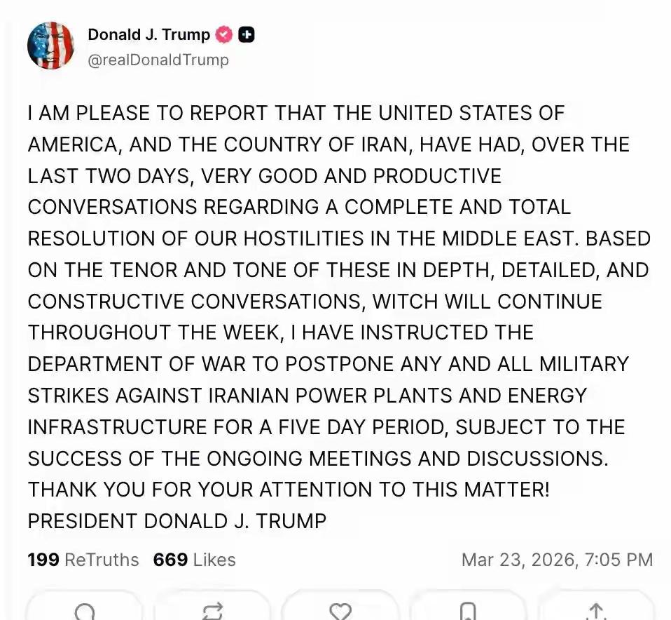 特朗普再次犯怂 自己找个理由推迟五天 美以对伊朗动武会有哪些影响 特朗普发文称与伊朗谈判取得进展,军事打击推迟。 而伊朗法尔斯通讯社援引消息人士的话报道说,伊朗与美国没有直接沟通,也没有通过斡旋方进行沟通。 不由得让人又想起那个笑话。白宫提供照片证据,证明特朗普与 China 进行了非常好、最好的对话。