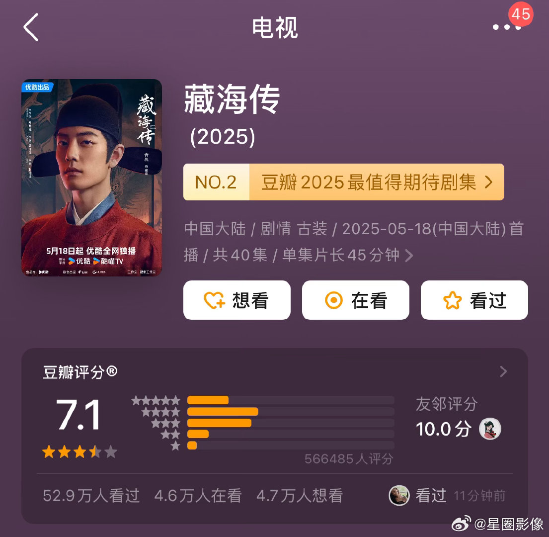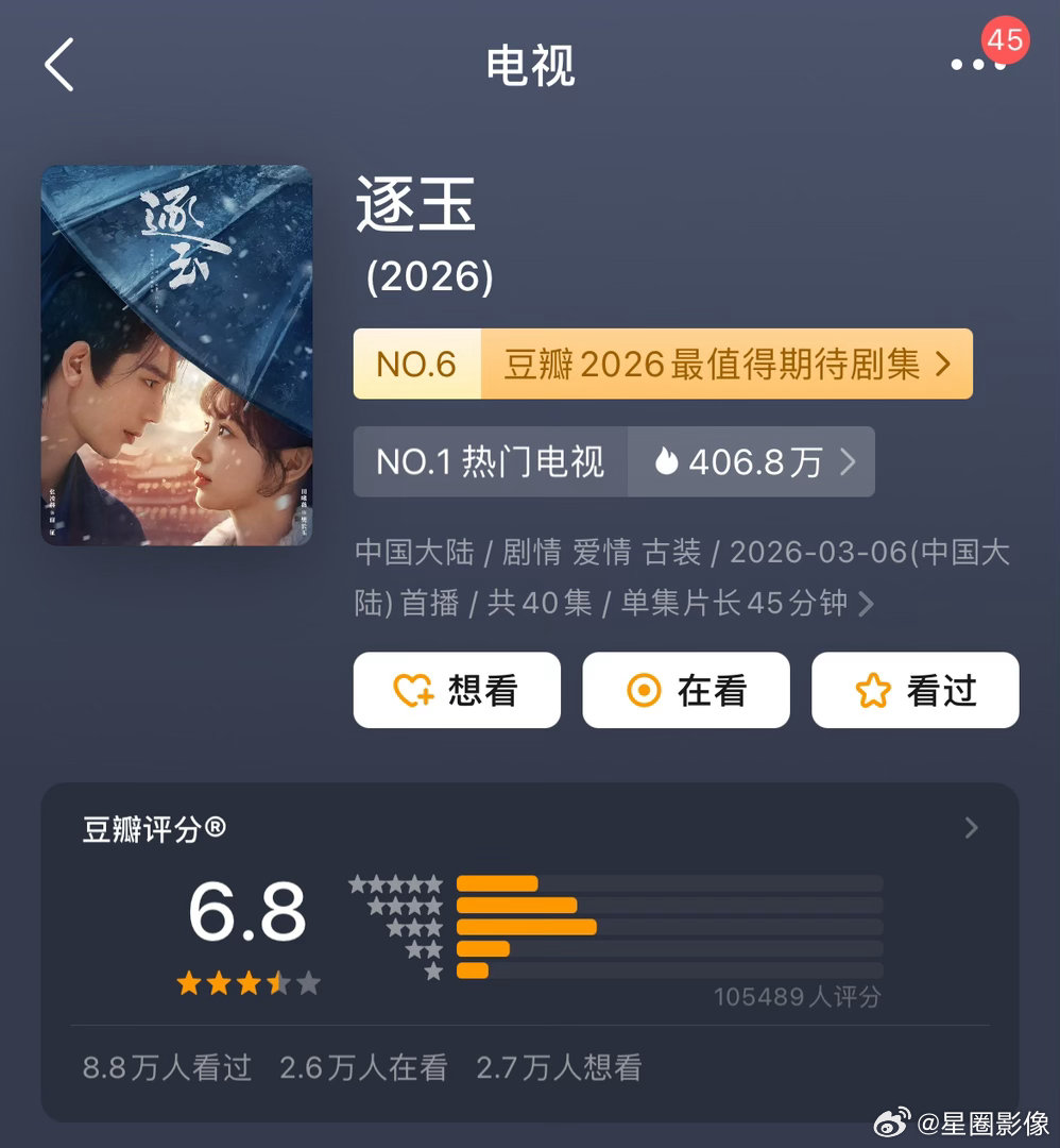 豆瓣评分云合史上破40%市占率的七部剧,豆瓣评分人数依次为:狂飙104万人,藏海传56万人,庆余年37万人,赘婿生万物许我耀眼20万加。逐玉开分时8万,目前涨到十万。