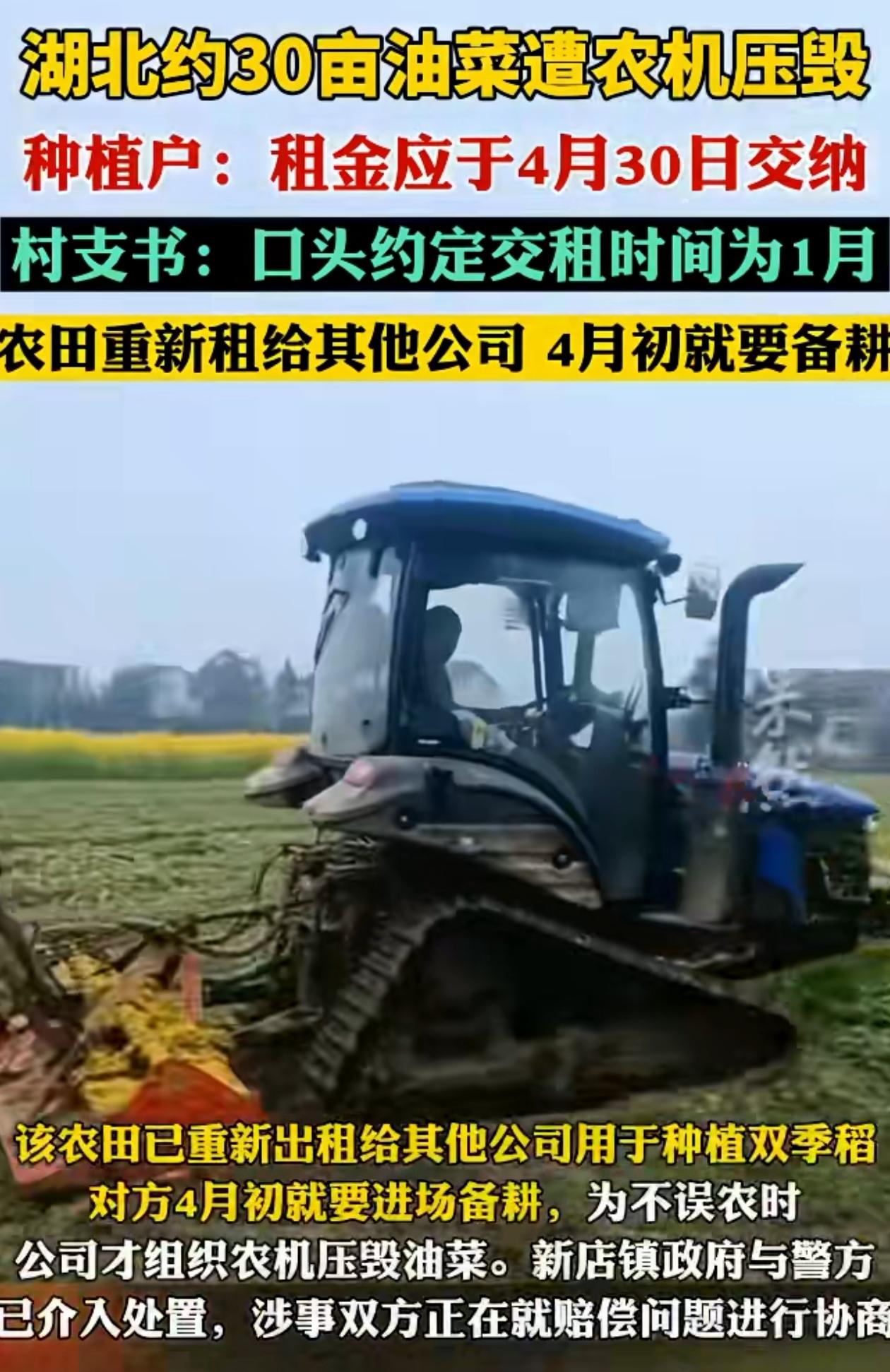 看着都心疼!湖北咸宁,一个农户家里种了30亩油菜花,长势挺好,眼瞅着就要收了。结果呢,村里有人开来两台农耕机,直接把整片田给压了。满地的油菜花,黄的黄的,倒的倒的,一片狼藉 农户当时就气得不行。辛辛苦苦种了大半年,眼看着到嘴边的收成,就这么没了,可村里这边,也有自己的说法 村支书讲得很清楚,他们这地是租一年交一年钱。这家人去年租了一年,本来今年一月份就该交下一年的租金了,但一直没交。村里等来等去,觉得可能人家不打算续租了,就把地又租给了另一户人家 新租户急着种水稻,看田里还有一大片油菜花,怕耽误农时,干脆就开了农耕机进场,直接把油菜花全推平了 村里态度倒也干脆,说这批油菜花值多少钱,他们愿意赔 但网友们议论纷纷,都说这不是赔不赔钱的事儿。粮食长得好好的,就这么糟蹋了,多可惜 这事儿要说清楚,其实得分几层来看 头一层,合同问题。租金没按时交,村里把地转租给别人,从道理上讲,村里觉得是“你不交钱就是不要地了”,逻辑上说得通。但从程序上,是不是该催一催、问一问,给个明确的最后期限?毕竟种地这事不是买菜,一季庄稼下去,从播种到收获,那是大半年的心血。如果提前说清楚“再不交钱我们就另租了”,农户至少有个准备,该收的收,该让的让,不至于到最后一刻被推了才知情 第二层,是那个“急着种水稻”的说法。水稻有水稻的农时,油菜有油菜的收成。新租户担心误了农时,这个心情可以理解。但既然知道地里还有庄稼没收,是不是可以提前跟原来的农户沟通一下?哪怕给个三两天,让人家把油菜抢收一部分,也算是个交代。直接开农机推平,这个做法确实太急了 第三层,也是最让人心疼的地方,就是粮食。30亩油菜,不是个小数目。油菜籽能榨油,油菜秆能还田,都是实打实的产出。现在整片推平,看着就是一堆倒伏的秸秆。不管谁对谁错,粮食被糟蹋了,这是板上钉钉的事实。农民最看不得这个,种过地的人都懂,一粒种子从埋进土里到长成庄稼,中间浇了多少水、施了多少肥、操了多少心,外人没法完全体会 村里说愿意赔钱,赔的是油菜的经济价值。这个态度至少说明他们承认有损失,愿意承担责任。但问题是,有些东西不是钱能完全补回来的 农户心里的那个劲儿,那一季的盼头,还有眼睁睁看着自己种的庄稼被推掉的那份难受,不是赔多少钱就能抹平的。