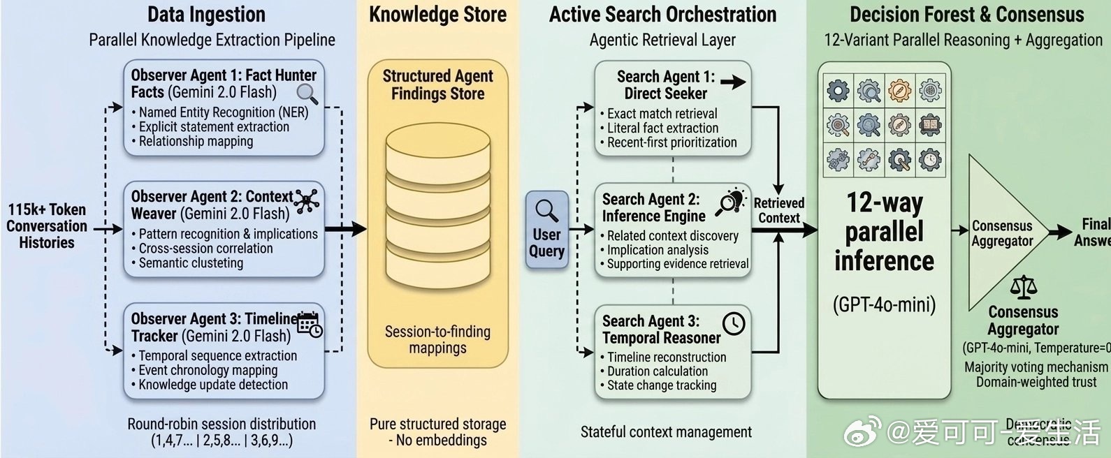 回答阶段用了两种策略测试。第一种是8个高度专业化的prompt变体并行运行(精确计数专家、时间专家、上下文深挖专家等),只要任何一条推理路径答对就算成功,准确率98.6%。第二种是12个Agent独立作答后,由一个聚合器LLM综合投票裁决,准确率97.2%。