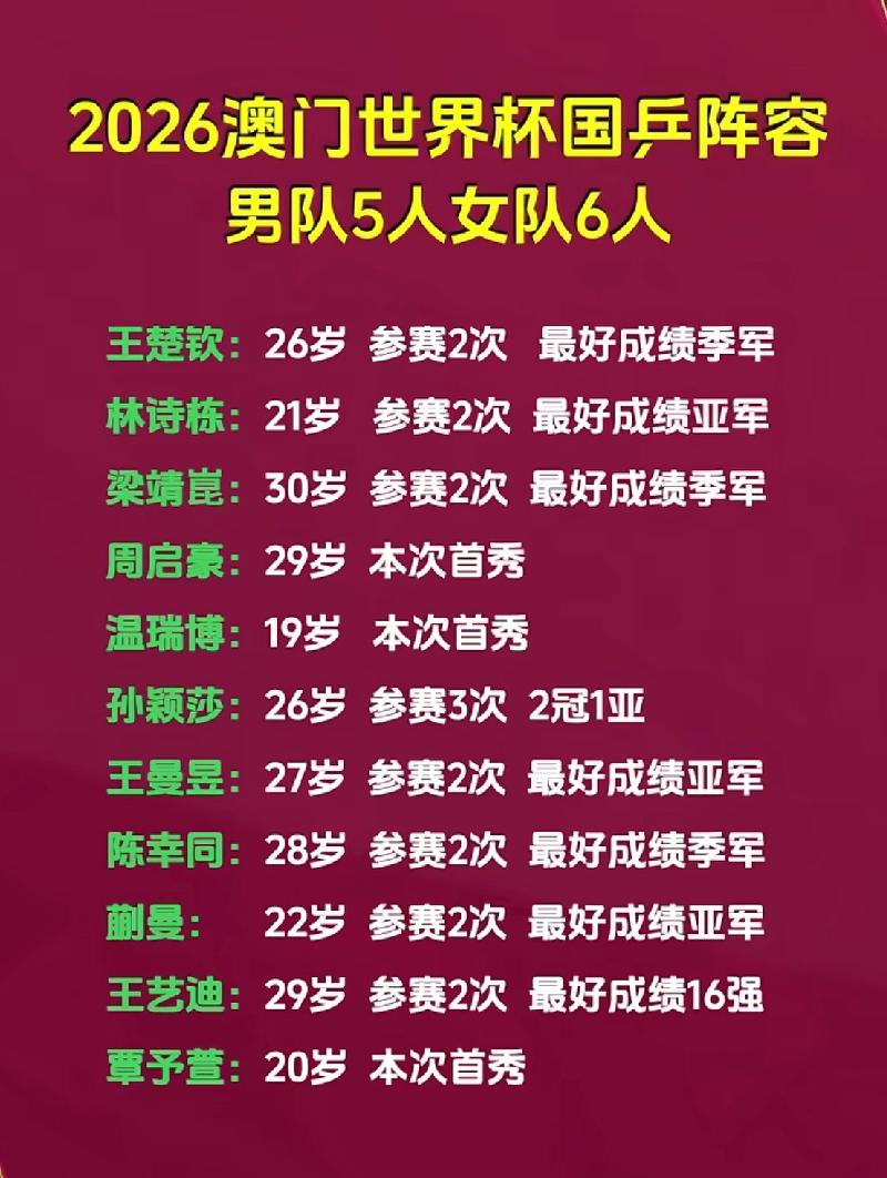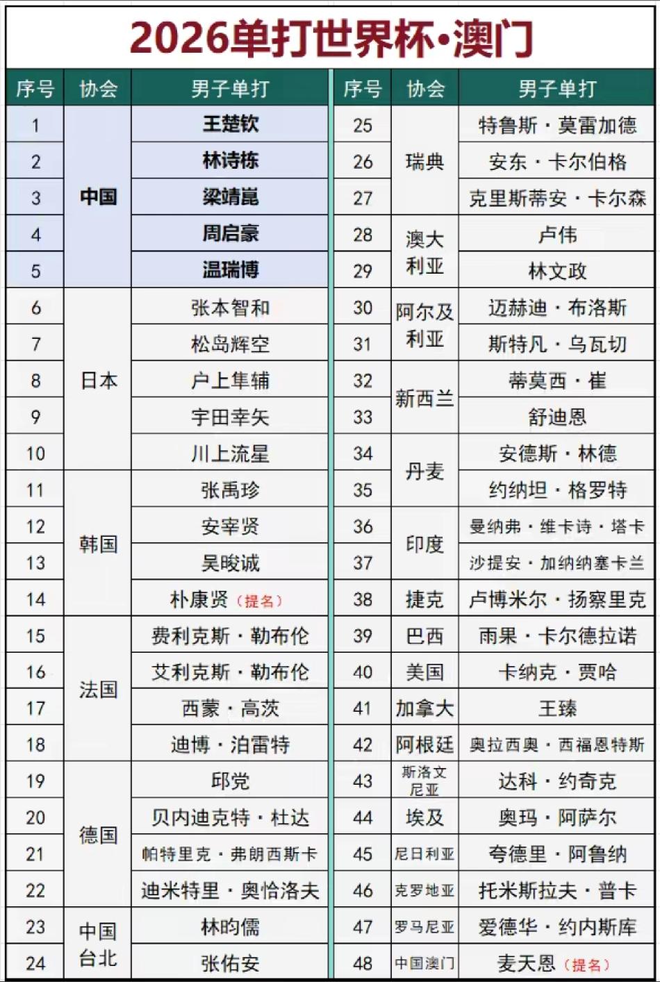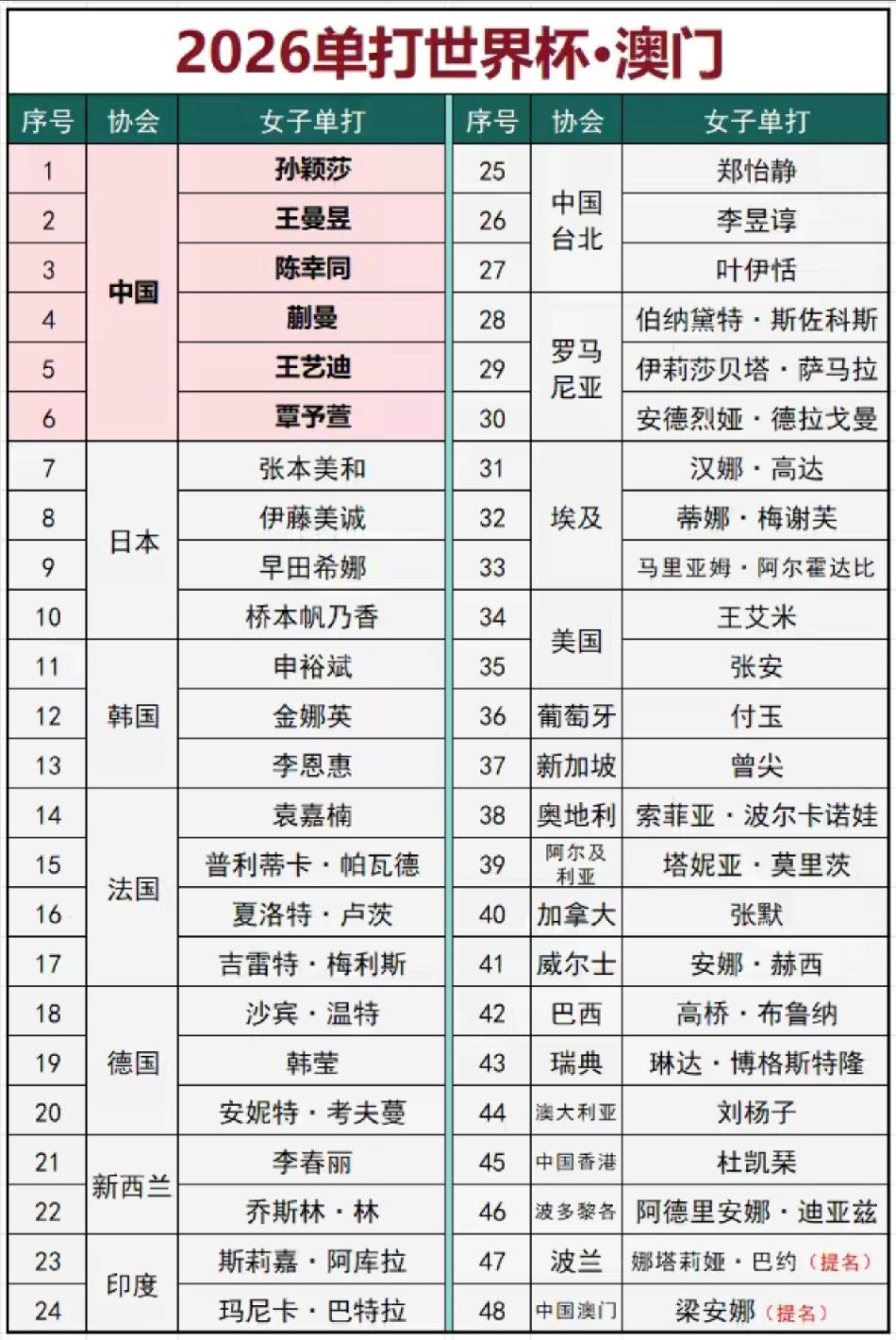 2026澳门世界杯国男乒5人参赛,为什么国女乒报名6人?为什么日男乒也是5人参赛,日女乒却4人报名? 2026年澳门乒乓球单打世界杯3月30~4月5日在中国澳门举行。国男乒报名王楚钦,林诗栋,梁靖崑,周启豪和温瑞博5人;日本男乒报名张本智和,松岛辉空,户上隼辅,宇田幸矢和川上流星5人。 ●按照国际乒联澳门单打世界杯的入围规则: 1. 男女单打各 48人参赛 2. 最近一屇世乒赛冠军和世青赛U19冠军(2人),且不占协会名额 3. 亚欧非美大洋洲五大洲际杯四强直接入围(20人) 4. 东道主提名2人 5. 剩余24名按世界排名 5. 每个协会常规上限:4男4女 ●国男乒5人入围: 王楚钦,2025年世乒赛冠军自动入围,不占名额。 林诗栋,梁靖崑,周启豪和温瑞博:根据2026年第八周,即2月17日国际乒联公布的世界排名入围。 ● 国女乒6人入围: 孙颖莎: 2025年世乒赛冠军自动入围,且不占名额; 王曼昱,蒯曼和陈幸同: 2026年亚洲杯四强入围; 王艺迪:世界排名入围; 覃予萱: 2025年罗马尼亚世青赛U19女軍冠军自动入围,且不占名额。 ● 日本男乒5人入围: 张本智和和户上隼辅:2026年海口亚洲杯四强入围。 松岛辉空和宇田幸矢:2026年第八周,即2月17日国际乒联公布的世界排名入围。 川上流星:2025罗马尼亚世青赛U19男单冠军入围,且不占名额。 ●日本女乒4人入围: 张本美和:2026年亚洲杯四强入围。 伊藤美诚,早田希娜和桥本帆乃香:2026年第八周,即2月17日国际乒联公布的世界排名入围。 日本的川上流星入围和国女乒覃予萱入围一样,都是凭世青赛U19单打冠军入围,而且都不占名额。日本女乒没有额外入围不占名额的条件,按照赛制要求最多只能报4人。 详细情况参看下图。