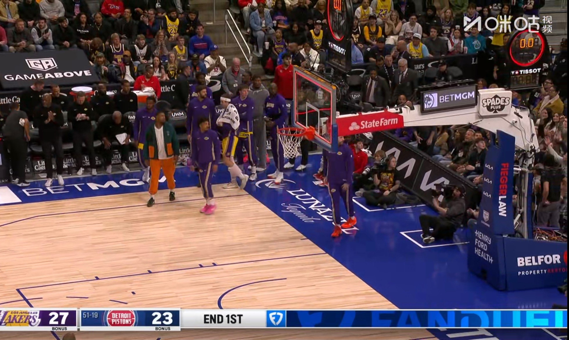 第一节,湖人27-23活塞!肯纳德那个快攻急了。 范德彪上来有篮板。 湖人vs活塞