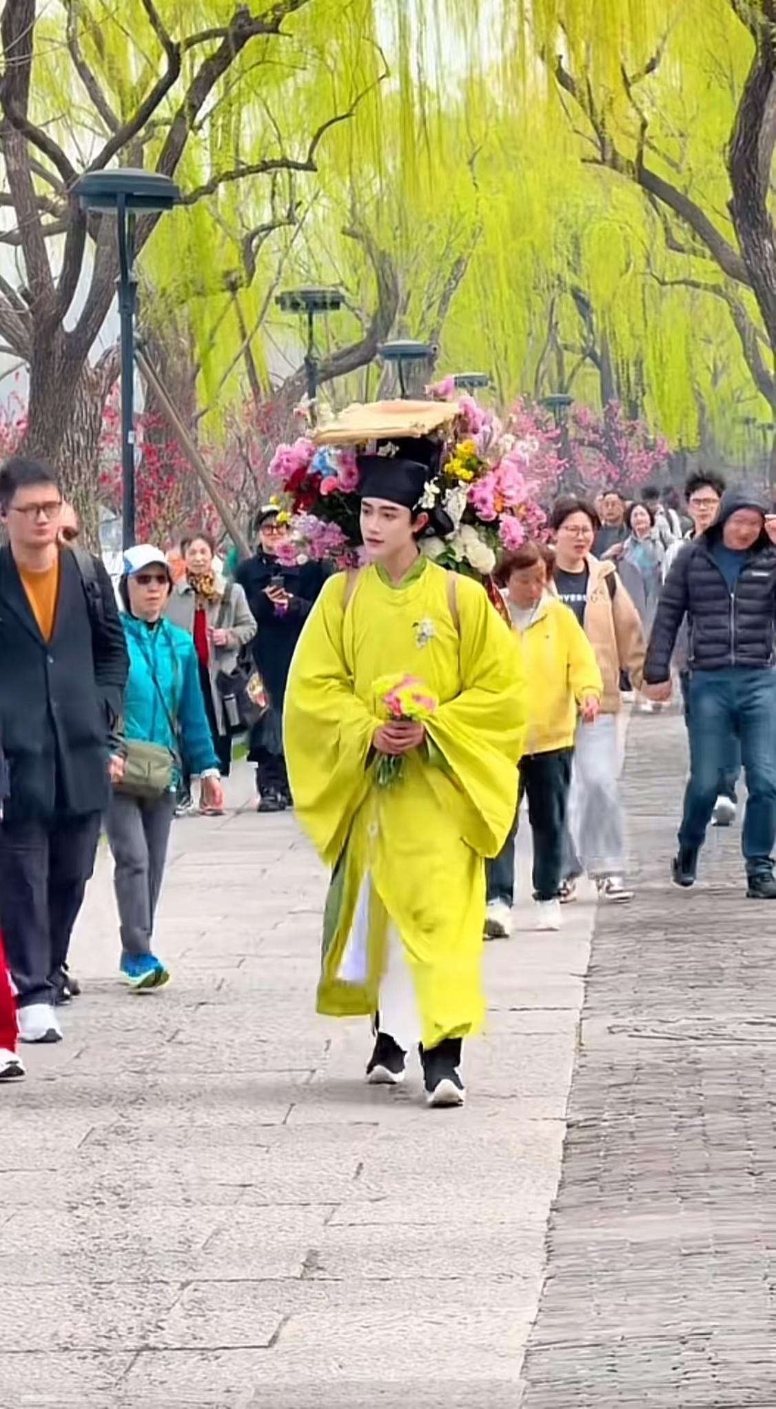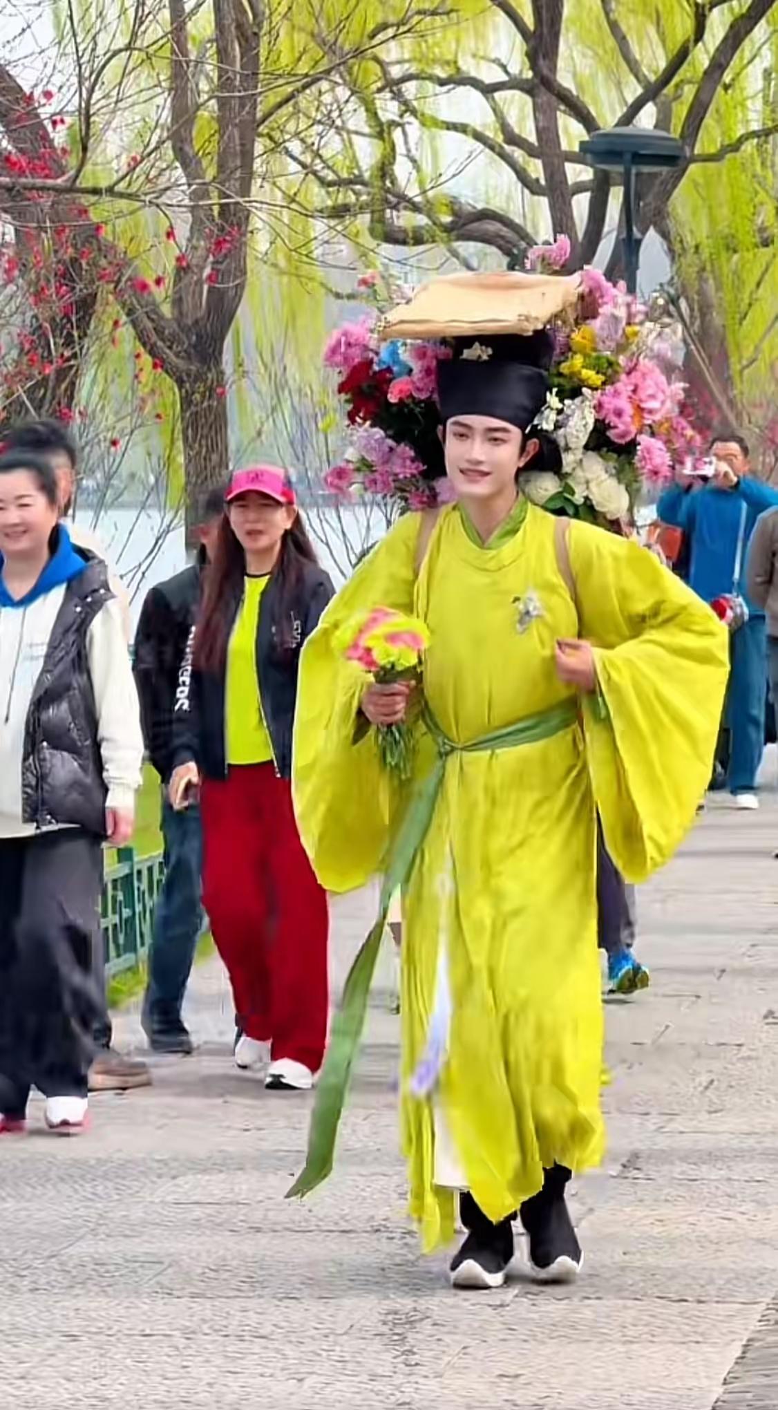 这位簪花郎怕是要火出圈了! 西湖边来了一位卖花郎,像是从《清明上河图》里缓步走来的春日限定美男。 见其一身黄布衫,头戴黑沿帽,背挎一蓝画簇,风过处,花枝轻颤,衣袂翩跹,自带一缕清浅芬芳。 走在路上,路人纷纷侧面,恍若穿越了一般。绝美簪花少年 簪花先生 簪花美少年 西湖装造簪花 花神簪花 簪花盛开 簪花将军