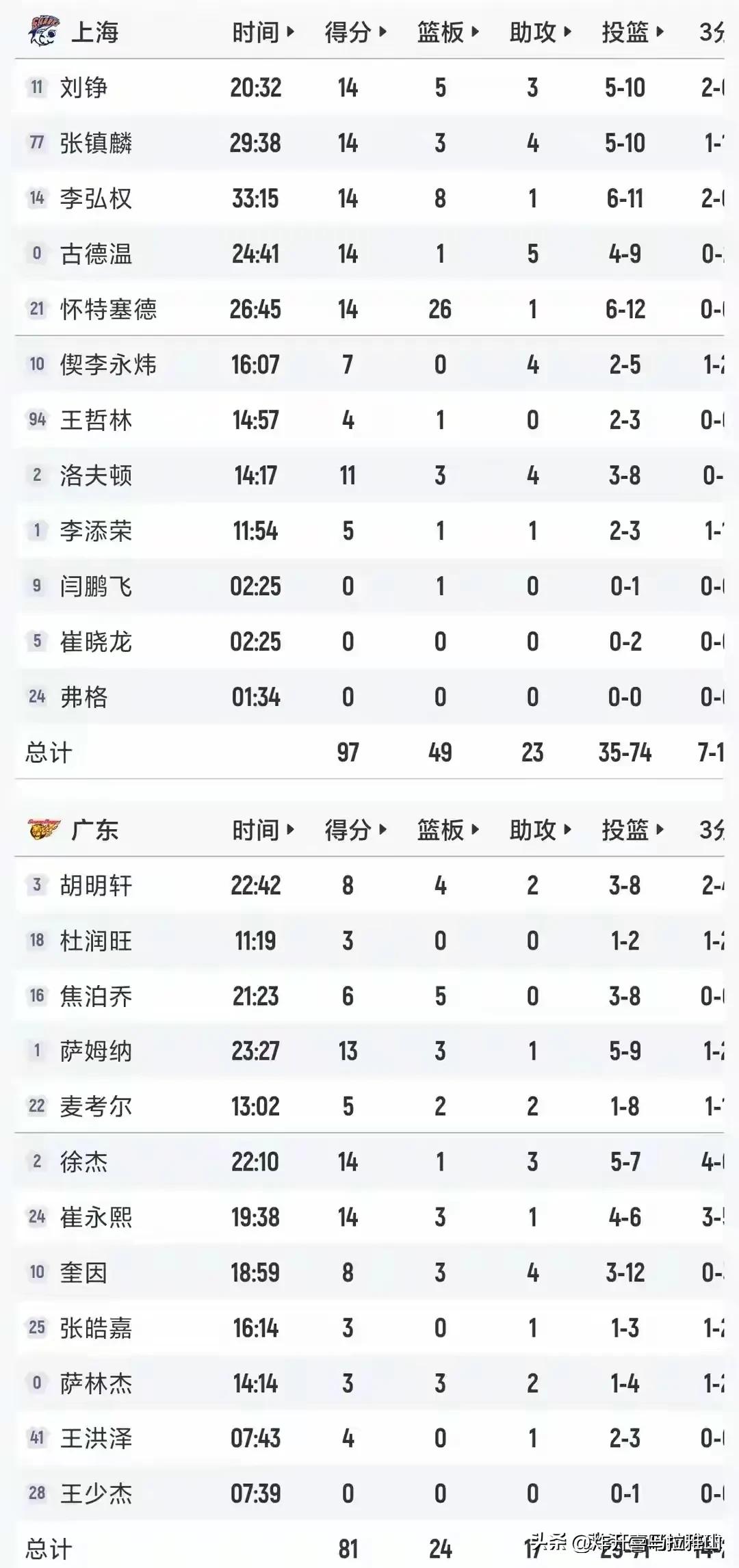 上海男篮主场大胜广东男篮16分,让我们看清五个事实。 1、上海队实力太强了,每节都能赢广东队,第四节全华班放水除外,否则全场得赢30分以上,而且首发阵容每个人都拿到14分,这说明球队打球不累,进攻端非常合理,每个人都有贡献,不依赖某个人的超级发挥,是一场彻彻底底的团队胜利,目前上海队整体状态在CBA断崖式的领先。 2、怀特塞德拿到26个篮板球,比广东队全队25篮板还多一个。这个数据太吓人,广东队只要投不进大多数篮板球都被他拿到,让广东队几乎没有二次进攻的机会,有了篮板球作为保证上海队投篮信心满满,这是上海队赢球端的根本原因。 3、上海队的三分球没有投开,全场一共才19投7中,这说明卢伟教练随机应变了,一看刘铮李弘权的手感不好,就改打打篮下和反击了。只能说卢伟这个赛季执教能力进步很大。 4、上海队和上个赛季有些本质区别是有怀特塞德张镇麟和偰李永炜这三点上了。这三个人全都拉高了各个位置上的高度,同时防守端又都在线,让上海队可以去打硬仗了,让主教练手里的牌更多了! 5、张镇麟打首发的四号位让大家有些吃惊,这是杜峰万万没想到的,所以张镇麟在开局阶段连得五分,因为和他对位的是杜润旺,他在运动能力上吊打杜润旺。不得不说张镇麟打四号位真的挺大胆的。