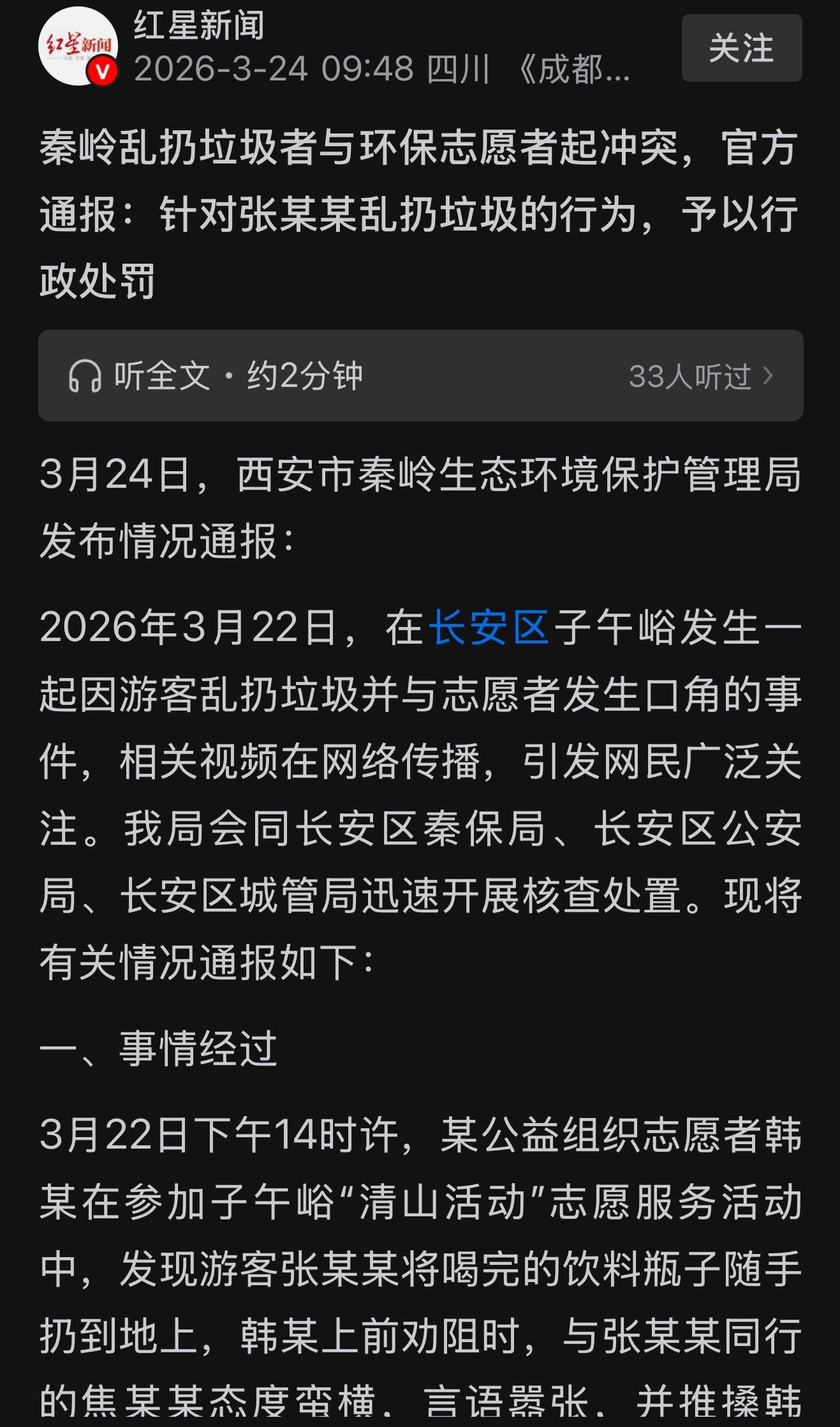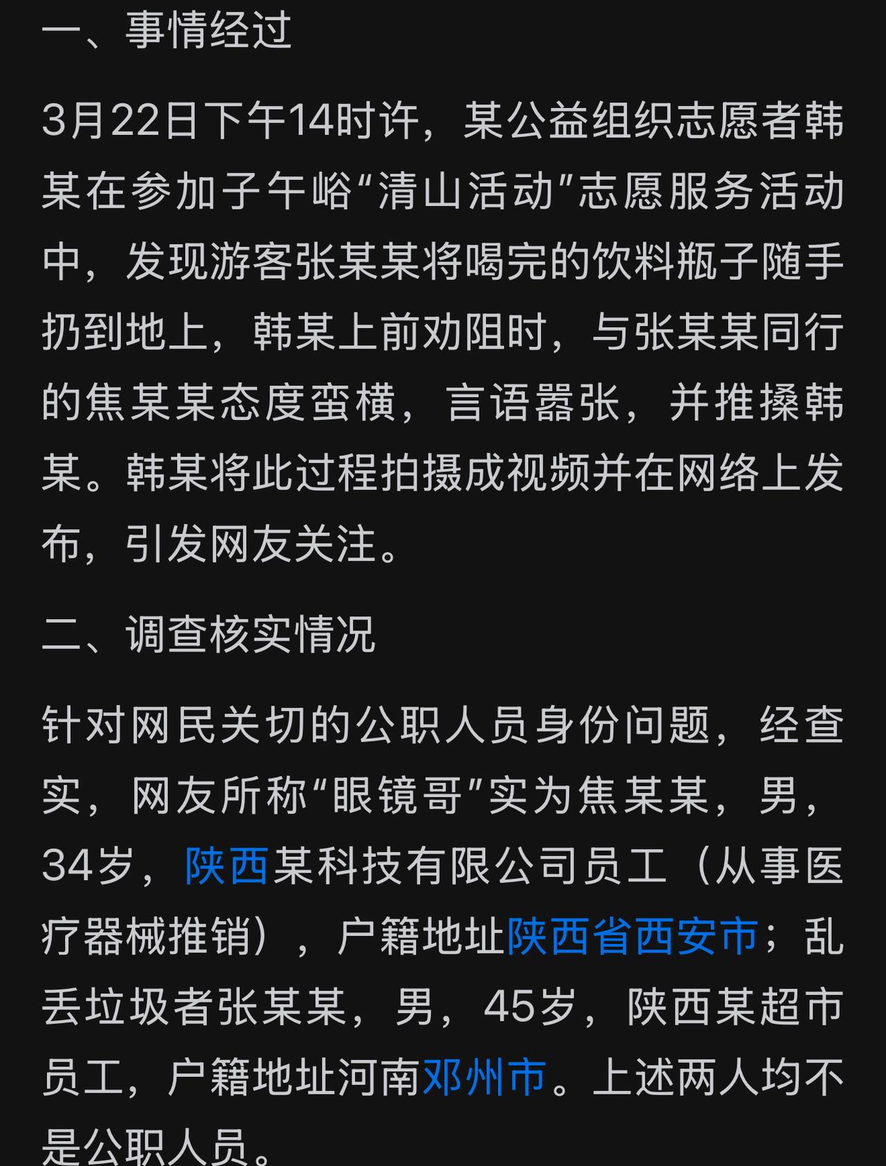 最新!秦岭子午峪乱扔垃圾人员身份已经曝光,大家不要乱猜了,不是公职人员! 态度比较嚣张的眼镜哥是焦某某,一个医疗器械推销人员,他没有扔垃圾;扔垃圾的是张某某,45岁,西安某超市工作人员,河南邓州人!他们都不是公职人员,秦岭当地官方发布信息了!公安机关已经介入调查了,大家不要再猜测了!大家看下面媒体报道!