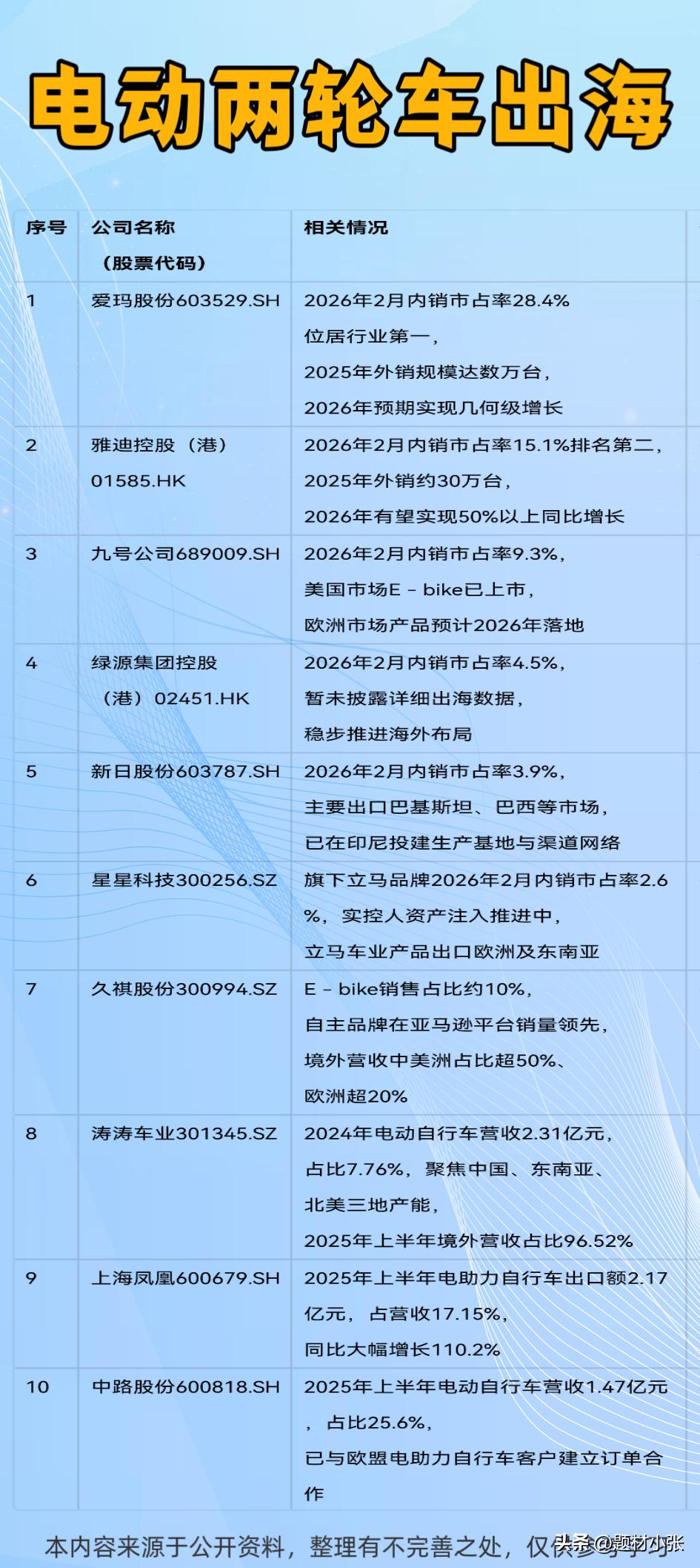 油价高位+海外需求爆发,中国新能源出行出海正当时! 从电动两轮车到新能源汽车、客车,再到核心配件,全产业链加速抢占全球市场: 越南电摩销量暴增4-5倍,爱玛、雅迪、九号等头部品牌外销规模持续放量,久祺、涛涛车业境外营收占比领先。配件合作商八方股份、信隆健康等配套商深度绑定全球电动两轮车供应链。 比亚迪、奇瑞等车企2月出口量稳居前列,中国技术优势正转化为全球份额。 客车方面同样表现亮眼,金龙、宇通深耕海外公交市场, 新能源出行出海赛道迎来黄金发展期,中国智造正驶向更广阔的世界舞台。值得收藏!