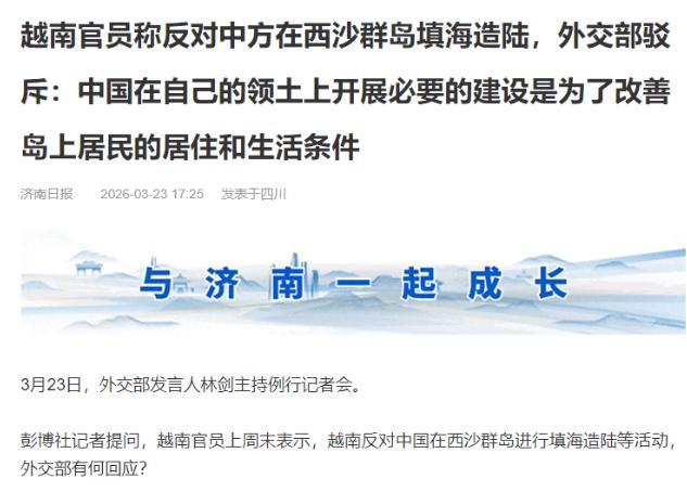 就在刚刚! 外交部硬气回怼越南 3月23号,外交部开了例行记者会,发言人林剑直接怼了越南官员的不当发言,态度特别坚决,看了真解气。 上周末越南部分官员突然跳出来,反对中国在西沙群岛填海造陆,摆出一副“管闲事”的姿态,仿佛西沙群岛跟他们有半毛钱关系,这种无端指责既没历史依据,也没法理支撑,纯属没事找事。 先把最核心的事实摆到台面上:西沙群岛是中国老祖宗留下来的固有领土,这不是随口一说,是有几千年历史实锤的。早在西汉时期,中国人就开辟了途经南海的海上丝绸之路,东汉的《异物志》里,明确把南海诸岛记作“涨海崎头”,其中就包含西沙群岛,这比越南声称的“发现西沙”早了足足1400多年。 往后历朝历代,中国对西沙的管辖从来没断过,北宋朝廷专门派水师在西沙一带巡航设防,维护海域治安;元代天文学家郭守敬开展“四海测验”,把南海观测点设在西沙海域,这是国家层面行使主权的铁证;清代的官方地图,比如《大清万年一统天下全图》,清清楚楚把西沙群岛划入中国版图,标注得明明白白。 近代以来,中国对西沙的主权更是白纸黑字、有据可查。1909年,广东水师提督李准亲自带队,率领官兵巡视西沙,给15座岛屿逐一命名、立碑升旗,当着全世界的面重申中国主权。 二战期间,西沙群岛被日本非法侵占,战争结束后,中国作为战胜国,依据《开罗宣言》《波茨坦公告》等国际条约,在1946年11月派军舰专程接收西沙,在永兴岛立下“海军收复西沙群岛纪念碑”,派兵驻守、设立气象站和灯塔,彻底完成主权收复。就连当年的旧金山对日和约,都明确要求日本放弃对西沙群岛的一切权利,国际社会普遍认可西沙归属于中国,那段时间根本没人提出异议。 最打脸的是,越南自己曾经多次公开承认西沙群岛是中国领土,还是官方盖章的正式文件,想赖都赖不掉。1956年,越南民主共和国外交部副部长雍文谦接见中国驻越外交官时,明确表态:根据越南方面的资料,从历史上看,西沙群岛和南沙群岛应当属于中国领土,当时越南外交部亚洲司官员还补充,西沙早在宋朝就属于中国,这是越南官方自己给出的历史结论。 1958年9月4日,中国发布领海声明,明确西沙、南沙群岛属于中国领土,领海宽度为12海里。仅仅10天后,时任越南总理范文同就正式签发外交照会,致信周恩来总理,郑重表示越南政府承认和赞同中国的领海声明,尊重中国对西沙、南沙群岛的主权。 这份照会盖着越南政府公章,是具备法律效力的外交文件,不是随口的客套话。甚至到1960年,越南人民军总参谋部出版的世界地图,依旧把西沙群岛标注为中国领土,教科书里也写得清清楚楚,这些旧材料现在还能找到原件,越南如今的说法,完全是自己打自己的脸。 后来越南态度大变,无非是看上了南海的资源和战略位置,开始出尔反尔、篡改历史,把曾经承认的事实抛到脑后。这种翻脸不认人的操作,既违背了国际法的禁止反言原则,也丢了外交信义。国际法认定领土主权,看的是最早发现、最早开发、持续有效管辖,这三点中国全占,越南拿不出任何一条站得住脚的历史和法理依据,只能靠无端指责刷存在感。 再说中国在西沙的填海造陆,本身就是在本国领土上开展的建设活动,目的是完善岛上的民生设施、提升海上救援能力、保障航行安全,跟其他国家半毛钱关系没有。就像别人在自家院子里修房子,外人无权指手画脚,越南这番操作,纯属越界干涉中国内政,既不合理也不合法。 这些年越南在南海问题上小动作不断,一边想靠着中国发展经贸,一边又在领土问题上挑衅,这种“既要又要”的心态,实在让人看不懂。中越两国是邻居,本该和睦相处、互利共赢,可越南部分官员总是拿西沙说事,刻意制造矛盾,不仅破坏双边关系,也不利于南海的稳定。 事实上,西沙群岛周边的海域管控、设施建设,一直都在中国的有序推进中,不管外部怎么叫嚣,都改变不了西沙属于中国的事实。中国在领土主权问题上从来没有退让的余地,老祖宗留下的领土,一寸都不能丢,这是底线也是原则。 越南与其费尽心机搞这些无用的挑衅,不如正视历史、尊重事实,收回那些不当言论,踏踏实实跟中国处理双边关系。毕竟,篡改历史掩盖不了真相,无理挑衅也撼动不了中国捍卫领土主权的决心,硬要在西沙问题上胡搅蛮缠,最后只会自讨没趣。 国际社会看得一清二楚,西沙主权归属没有任何模糊空间,越南的无端指责,本质上是违背历史潮流的无理取闹。中国外交部的硬气回怼,不是刻意强硬,而是对事实的坚守、对主权的捍卫,任何试图侵犯中国领土主权的行为,都会遭到坚决回击,这一点从来没有商量的余地。