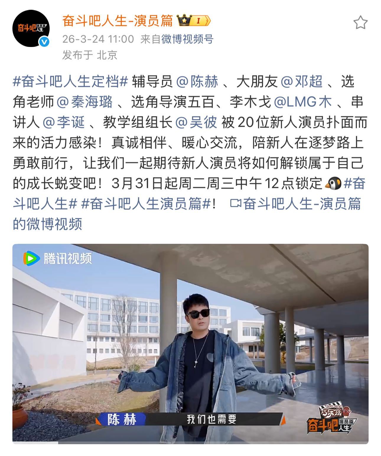 奋斗吧人生定档 最新演综《奋斗吧人生-演员篇》今天终于定档啦!谁懂我看见陈赫邓超合体的惊喜,还有秦海璐姐指导起表演绝对的权威,参加节目的20位新人演员你们真的有福啦,进步肯定飞速,坐等奋斗吧人生 3月31日开播,要开始奋斗啦!