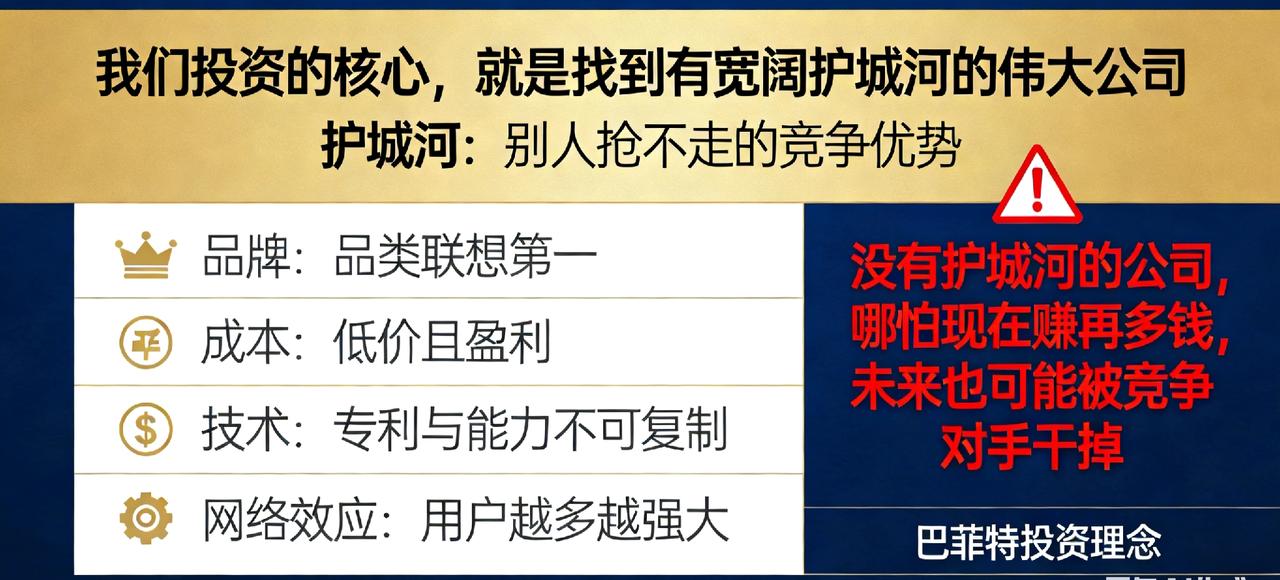 巴菲特说,我们投资的核心,就是找到有宽阔护城河的伟大公司。 什么是护城河?就是别人抢不走的竞争优势。 要么是品牌,别人一提这个品类,第一个想到它; 要么是成本,它能做到别人做不到的低价,还能赚钱; 要么是技术,它有别人无法复制的专利和能力; 要么是网络效应,用的人越多,它越强大。 没有护城河的公司,哪怕现在赚再多钱,未来也可能被竞争对手干掉。 巴菲特投资金句 巴菲特人生窍门 巴菲特点评 巴菲特理财智慧 巴菲特投资思想 巴菲特选股法 巴菲特交易智慧