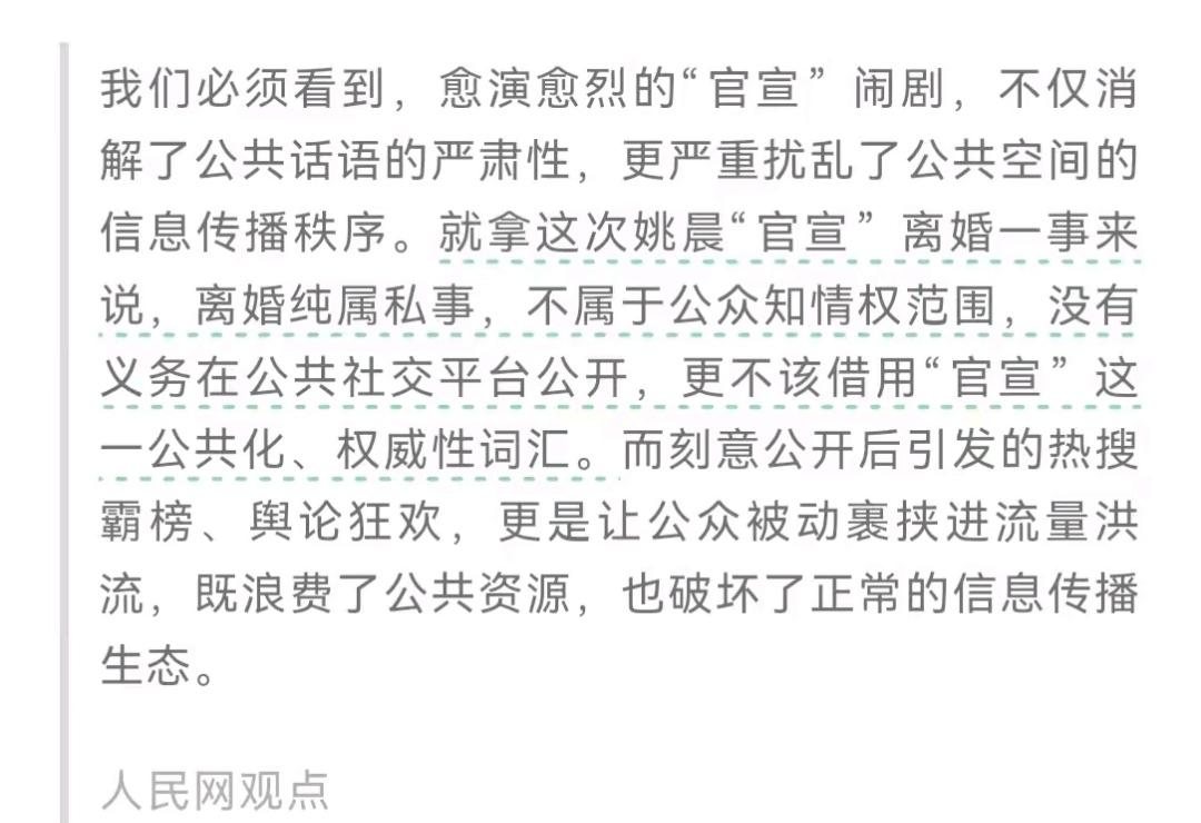 明星动不动就官宣, 人民网看不下去了, 事情的起因是, 姚晨离婚发声明一事, 在热搜霸榜了好几天。 人民网说, 离婚是私事, 法律没规定你必须告诉所有人, 你非要用“官宣”这种词, 搞得像发布国家大事一样, 等网友讨论开了, 你又来一句, 无意占用公共资源, 这不就是又当又立吗? 文章还点出一个扎心的现实, 明星把本该关起门来解决的家事, 非要包装成“新闻通稿”, 其实就是为了收割流量。 既然主动公开, 就别装无辜, 这话不仅说给姚晨听, 也是说给所有把私生活, 当成热搜工具的明星听的。 有意思的是, 网友分成两派, 一派觉得人民网管得对, 明星不该拿私事刷存在感, 另一派觉得, 人家说都说了, 你还批评就是多管闲事。 你觉得明星离婚该不该公开? 公开后又说无意占用资源, 是真的委屈还是假客气?
