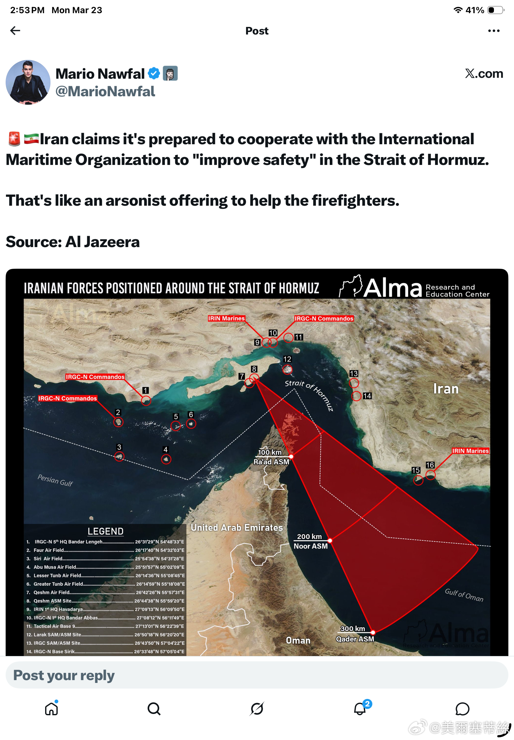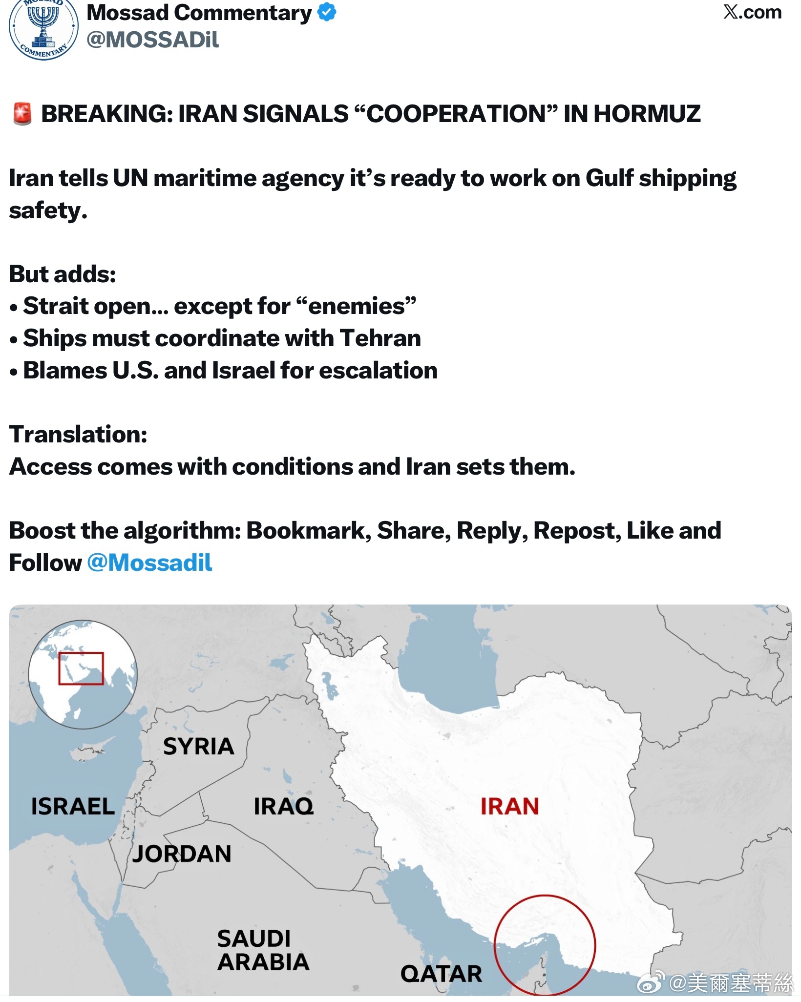 但同時補充道:• 海峽保持開放……但“敵對勢力”除外• 船隻必須與德黑蘭方面進行協調• 指責美國和以色列導致局勢升級