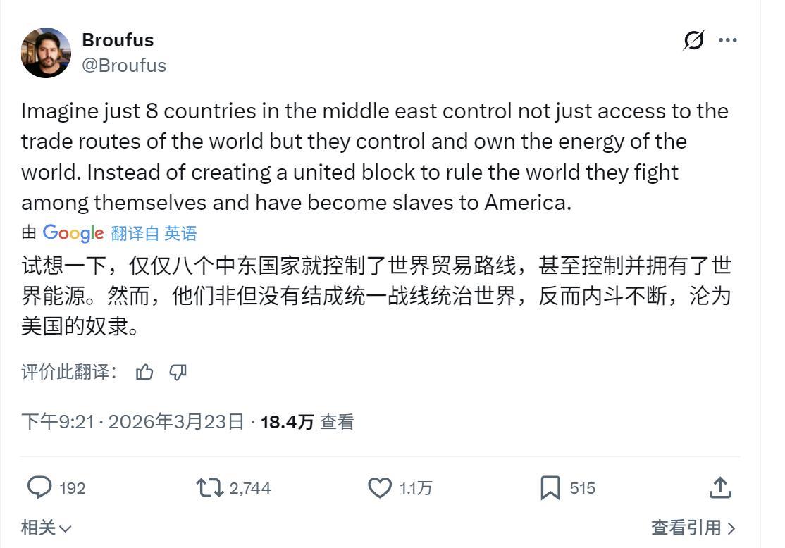 伊斯兰国家当前面临的困境,被阿拉伯网友道出了实情:坐拥石油和航道却不团结、互相厮杀,反倒成为美国的奴隶! 阿拉伯网友发文写道:“想象一下,中东8个国家,不仅控制着全球贸易通道,还掌握着世界能源。本应组成统一战线去主导世界,结果他们互相厮杀,反倒成为美国的奴隶。” 这言论真的一针见血的指出伊斯兰国家当前面临困局的问题所在,本来掌握着能源和通道一张好牌,却硬被美国制造分裂、分而治之。然后,源源不断给美国供给资源和财富,以维护美国的全球霸权地位。都说堡垒是最容易从内部攻破的,伊斯兰国家的现状就是真实的写照!