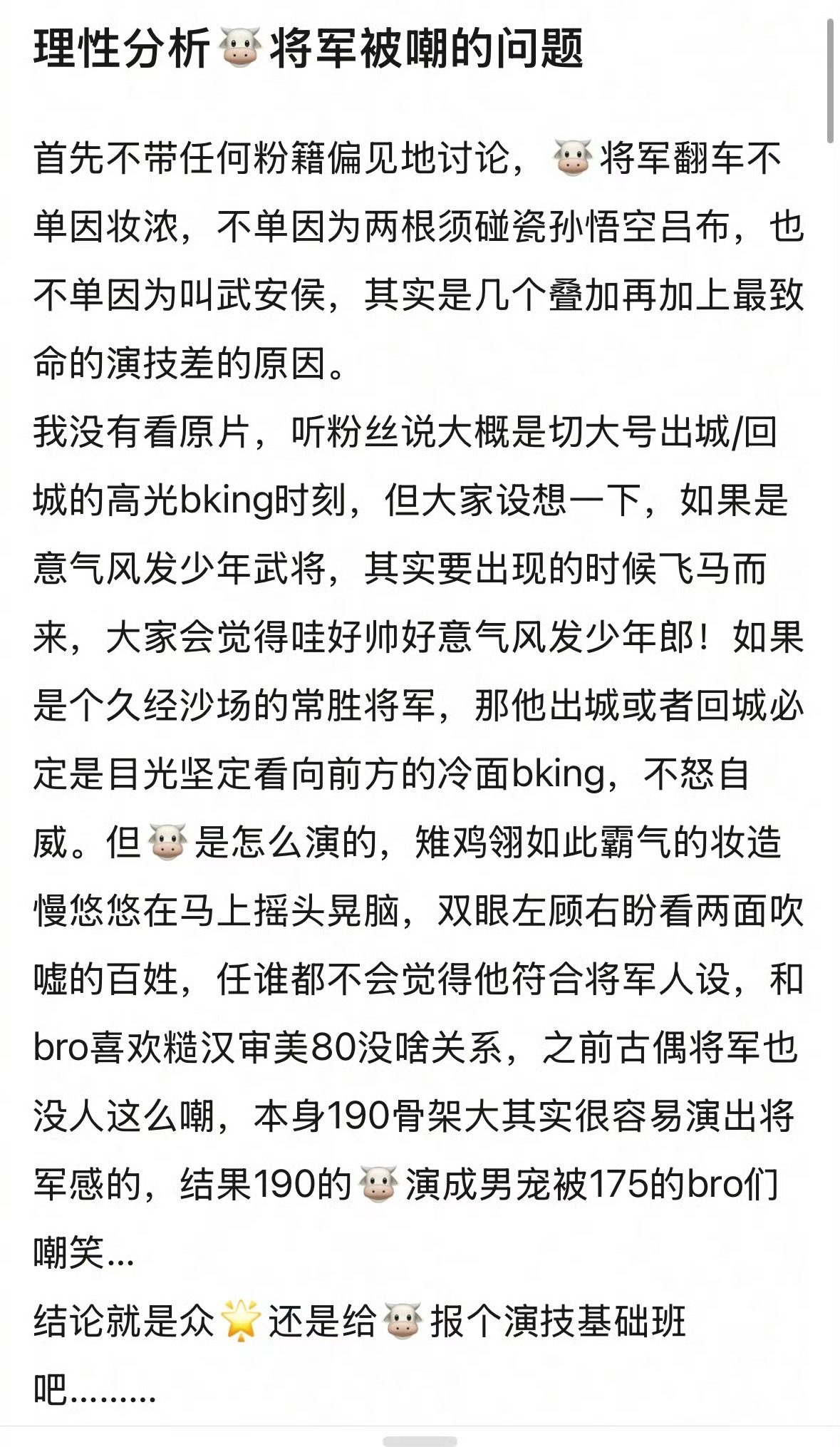 有人理性分析了张凌赫演将军被嘲原因,综合来说就是觉得他的演技有问题。个人觉得《逐玉》更大的锅在编剧那里,这部戏把男主塑造的太“弱”了,一个将军全程都在谈恋爱,唯独几次精彩的打戏也都是围着女主转圈,一个将领还被女主迷晕,被对方代替上了战场。