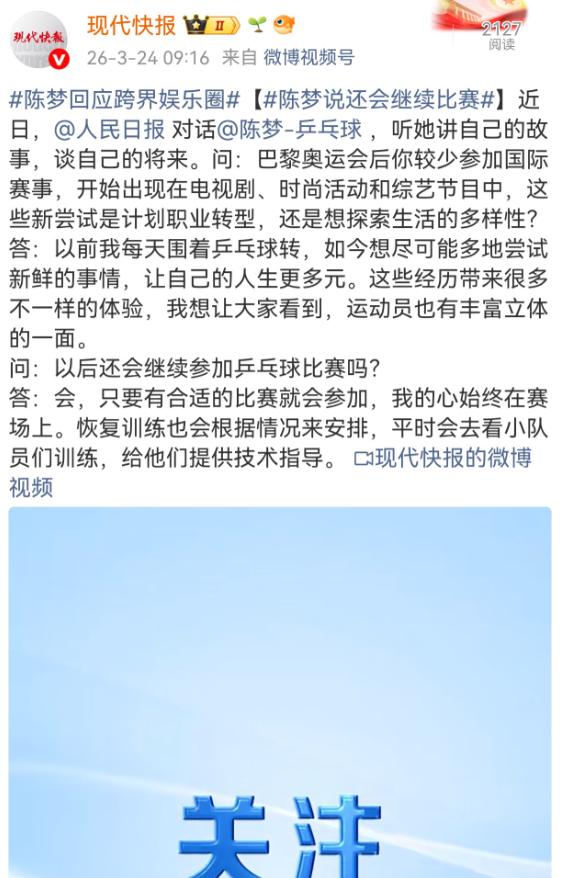 陈梦,高调回应! 3月24日一大早,乒乓球奥运冠军陈梦,突然冲上了高位热搜,原因是有网友质疑她在巴黎奥运会后,陈梦没像以前那样频繁参加国际赛事,反倒在电视剧、时尚活动和综艺节目里频频露面,这是要转型去当明星了吗?   这一疑问像一颗石子投入湖面,激起了全网的热议,支持者与担忧者各执一词,让这场关于陈梦职业选择的讨论愈演愈烈。   要弄清这场争议的来龙去脉,还要从巴黎奥运会结束后陈梦的活动轨迹说起。   作为乒乓球界的顶尖选手,陈梦多年来一直将全部精力投入到训练和比赛中,生活里几乎只有乒乓球、训练场和赛场,日复一日的高强度训练、密集的国际赛事,让她成为了赛场上令对手敬畏的冠军,也让球迷们习惯了她在赛场上拼搏的身影。   但巴黎奥运会卫冕之后,大家发现,陈梦参加国际赛事的频率明显降低,不再像以前那样密集出战各类国际大赛,取而代之的是,她开始出现在更多赛场之外的场合——电视剧片场有她客串的身影,时尚活动上她身着精致礼服亮相,综艺节目里她展现出赛场之外的另一面,这些变化都被网友看在眼里,疑问也随之而来。   网友们的质疑并非毫无依据,毕竟在大众的固有印象里,顶尖运动员大多会将全部精力放在赛场之上,而陈梦的跨界举动,打破了这种固有认知。   有人担心,频繁参与综艺、时尚等活动,会分散她的精力,影响她的训练状态,毕竟竞技体育容不得半点分心,国乒也需要像陈梦这样的老将压阵,大家不希望看到一位冠军因为跨界而荒废了自己的天赋和多年的积累。   但也有不少网友表示理解和支持,他们认为,陈梦为国争光多年,拿遍了各类赛事的冠军,承受了常人难以想象的伤病和压力,如今放慢脚步,尝试一些新鲜事物,丰富自己的人生,完全合情合理,不该被过度苛责。   面对全网的质疑和讨论,陈梦没有选择回避,而是在与《人民日报》的对话中,坦诚地给出了自己的回应。   她直言,过去这么多年,自己的生活完全围绕乒乓球展开,几乎没有多余的空间去体验赛场之外的生活,现在她只是想多尝试一些新鲜事物,让自己的人生变得更加丰富多彩,同时也想让大家看到,运动员并不是只有赛场上拼搏的一面,他们也是有血有肉、丰富立体的普通人。   陈梦的回应清晰而坚定,她明确表示,自己并没有要彻底离开赛场、转行当明星的打算,跨界与打球并不冲突,做什么事情她都会专注投入,只要有合适的比赛,她依然会站上赛场,她的心一直都在乒乓球上。   事实上,陈梦也用实际行动证明了自己的表态,她并没有因为跨界而放弃乒乓球,而是根据自身情况合理安排恢复训练,平时还会特意去观看小队员们的训练,耐心地为他们指导技术,尽自己所能为乒乓球事业助力。   除此之外,陈梦在跨界的同时,也没有忘记推广乒乓球运动,她积极参与公益活动,还开展了VR青训相关工作,用自己的影响力为乒乓球项目破圈,让更多人了解和热爱这项运动。   网友们对陈梦的质疑其实有些小题大做,乒乓球奥运冠军陈梦突然冲上高位热搜,原因是有网友质疑她在巴黎奥运会后没像以前那样频繁参加国际赛事,反倒在电视剧、时尚活动和综艺节目里频频露面,这是要转型去当明星了吗?   其实答案很明确,陈梦只是在坚守热爱的同时,选择拓宽自己的人生边界,这种选择不该被刻板印象束缚。   如今的体育圈,早已不是只有“赛场拼搏”这一种模式,越来越多的名将在保持竞技状态的同时,通过跨界破圈,传递体育精神、推广自己所从事的项目,陈梦的选择,正是这种趋势的体现。   她没有放弃自己热爱的乒乓球,也没有被冠军的标签束缚,而是勇敢地去体验不一样的人生,这种勇气值得肯定。   这场热搜争议,本质上是大众对运动员职业选择的不同理解。   陈梦一路走来,付出了太多努力,承受了太多压力,从默默无闻到站上奥运最高领奖台,她把最好的青春都献给了乒乓球。   如今,她选择放慢脚步,在乒乓球事业和多元生活之间寻找平衡,既坚守初心,又拥抱新鲜,这样的选择,理应得到更多的理解和支持,而不是无端的质疑和指责。   无论未来陈梦选择将更多精力放在赛场,还是兼顾跨界发展,相信她都会全力以赴,不辜负自己的热爱,也不辜负球迷们的期待。   毕竟,真正的冠军,从来不会被单一的标签定义,无论在赛场之上,还是赛场之外,只要坚守初心、全力以赴,就值得被尊重和喜爱。   如果各位看官老爷们已经选择阅读了此文,麻烦您点一下关注,既方便您进行讨论和分享,又能给带来不一样的参与感,感谢各位看官老爷们的支持!