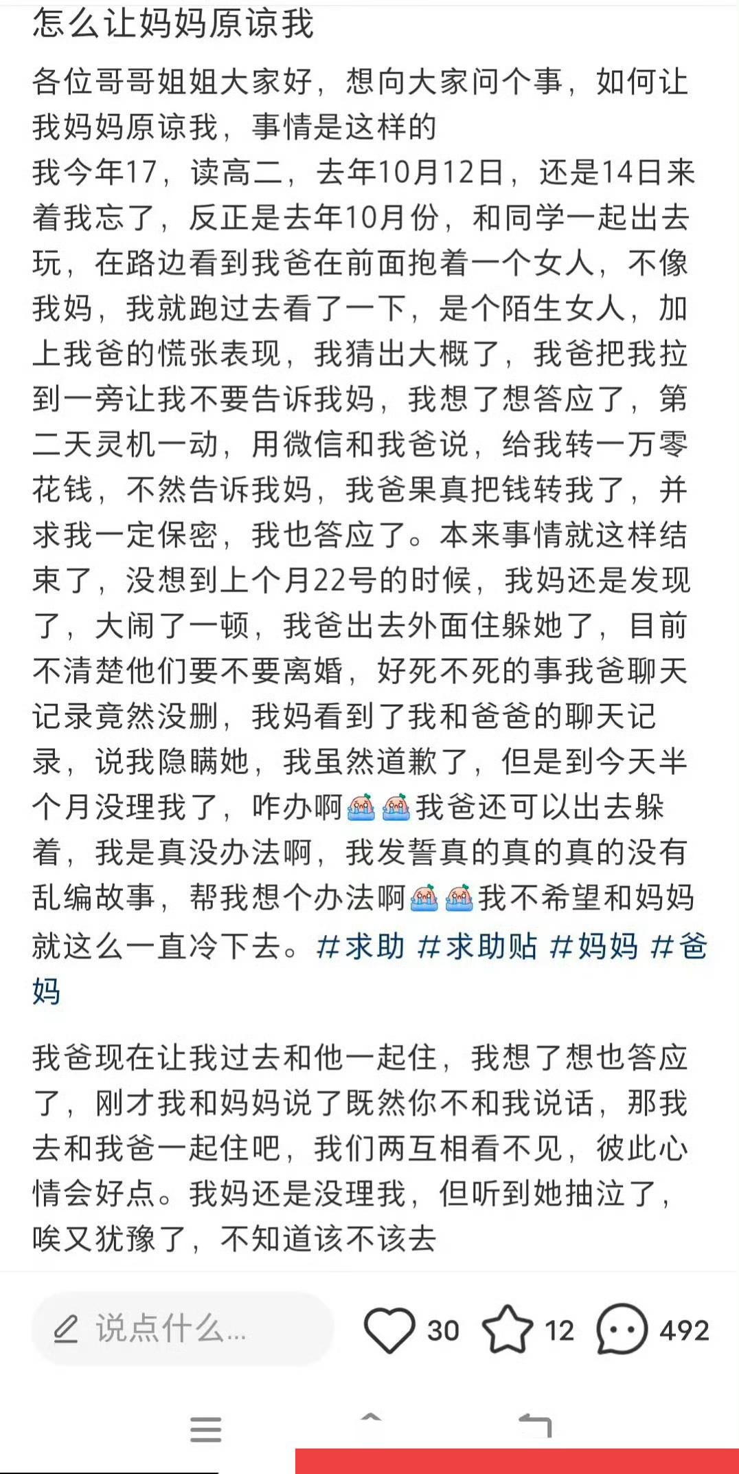 高二的中学生偶尔撞破父亲的奸情,父亲要他保守秘密,千万不要告诉他妈。这名中学生灵机一动,找父亲要一万块零花钱,父亲爽快的答应了。高中生选择选择沉默。终究纸包不住火,父亲在外面包养小三的事情被妈妈发现了,好巧不巧,妈妈还发现了高中生和父亲要钱的聊天记录。妈妈很生气,觉得儿子和爹合起伙来欺骗她。父亲选择逃避,去外面租房住。母亲对儿子怀恨在心,置之不理。父亲要儿子和他去住,儿子感情上舍不得离开妈妈,试探着去问妈妈,说爸爸叫他叫他和他去住,妈妈冷冷的回道,你去吧,我不想见到你。