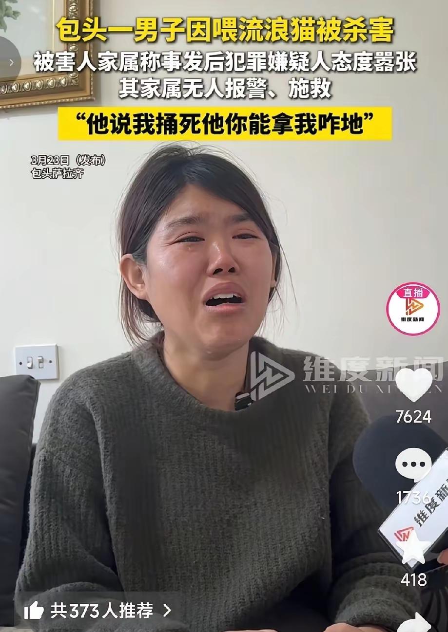 “泪目了”包头男子因投喂流浪猫被杀害,留下的最后一句话是给儿子的:爸爸没事,一会就回来! 起因是包头一男子将一块骨头包好,投喂流浪猫。被离过两次婚、脾气暴躁的邻居看见了,这位邻居此时又气儿不顺了,故意在小区群发图挑衅:“这是谁家的遗物啊,咋不拿回家供着呢!” 结果,就被男子给看到了,和邻居进行理论,邻居叫号“有能耐你下楼,咱俩当面说”。男子觉得自己光明正大,当面说就当面说呗,就穿上外套准备下楼。 这位邻居平时就经常和人发生口角,妻子觉得不太踏实,说要不别下去了,他说几句就说几句呗。男子说没啥事,我注意点,就下楼去了。 结果,他下楼刚和邻居打个照片,就被对方用双面开刃的刀捅进心脏的部位了。他赶紧给妻子打电话,让她叫救护车报警,妻子一边打电话一边往下跑,还碰见了邻居。邻居此时仍旧嚣张,放话说“我就捅死他谁能咋地!” 大儿子此时在楼上窗户喊“爸爸你怎么了”,被害男子回应说“没事,一会就回去了!” 谁能想到啊,这句话竟然成了诀别!时至今日,孩子还总能想起这句话,每天蒙着被子哭呢。 一条无辜的生命,就因为投喂几只流浪猫,永远离开了家人。明明只是心存善意的小事,却遇上了丧心病狂的恶人。那句对儿子说的“没事,一会就回来”,成了最扎心的遗言。 愿逝者安息,凶手必须受到法律最严厉的惩罚,也愿这样的悲剧,再也不要发生。