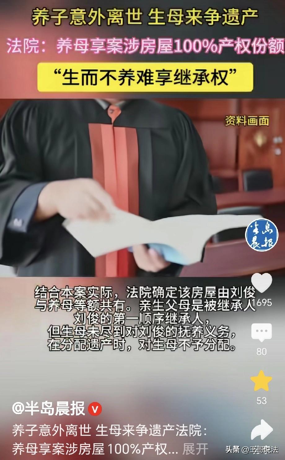 “吃相太难看!”湖南株洲,一男子刚满9个月,母亲离家出走,父亲养不了他,将他寄养给本村一位女子,女子成了养母,但没办理收养手续,她将男孩视为己出,男孩长大工作,女子和男孩合买了房子,房子写着母子俩的名字,可没想到,男子22岁溺水身亡,养母给他办了后事,后事办完,生母跳了出来,要求继承儿子的房产,养母大怒,孩子生养死葬你都没看一眼,哪来的脸来要房子?双方闹到法院,结果令人意想不到! 22岁的刘俊溺水离世,养母王瑶得到了消息,她哭到晕厥,这个她从9个月大,养到现在的孩子,是她王瑶最亲的人。 可还没等她从悲痛中缓过来,一个陌生女人突然出现在她家门口。 女人自称是刘俊的生母张梅,就是那个在孩子几个月大时,就离家出走,抛夫弃子,22年未露面的女人。 张梅的目的很直接:“我是他亲妈,这房子有我的份。” 可22年都未尽到母亲的责任,凭啥孩子死后,来分遗产? 刘俊的身世满是心酸,2003年他刚9个月大,生母张梅就抛了他,张梅走了,刘俊嗷嗷待哺。 生父刘志无力抚养,只能把他寄养在王瑶家里。 可这一养,就是22年,虽然王瑶没办正式的收养手续,却把刘俊当亲儿子疼。 寄养期间,父亲刘志负责他的生活费和学费,其他一切花销,都是张瑶在负担。 转眼间刘俊长大,工作之后,稍有积蓄, 王瑶和他一起买了房子,房产证上写着两人的名字。 而生母张梅,22年没给过孩子一分钱,没看过孩子一眼,甚至连刘俊的葬礼都没来看上一眼。 在她心里,好像忘记还有刘俊这个孩子,可是当她听到,刘俊意外死亡,留下一套房子,她却立刻跳出来要分遗产。 王瑶气的大声斥责,孩子才9个月,你就能舍下他跑了?就连他的后事,也没见你来看他一眼! 可张梅振振有词,我是他的亲生母亲,按照法律,我有继承权。 可是她忘了,权利和义务是对等的,生父刘志主动提出,把自己应继承的份额全部赠予王瑶。 刘志表示,这么多年,是王瑶把孩子养大,我没脸要儿子的房产! 之后,张梅,王瑶和刘志为房产对簿公堂! 法院认为,生而不养,难享继承权! 父母对子女有抚养教育的义务,这种义务是法定的,不能因为任何原因而免除。 法院判决,生母张梅对刘俊未尽抚养义务,不予分配遗产。 生父刘志主动放弃儿子房产份额,养母王瑶享有房屋100%份额。 天理昭昭,22年不管不问,现在来分遗产,脸往哪搁呢? 法律不是无情的,它保护的是真正付出的人,养母太不容易了,这房子就是她应得的! 《民法典》第1130条规定,有扶养能力和有扶养条件的继承人,不尽扶养义务的,分配遗产时,应当不分或者少分。 亲情从来不是靠血缘维系的,而是靠日复一日的付出和陪伴,生而不养,最终只能是竹篮打水一场空。