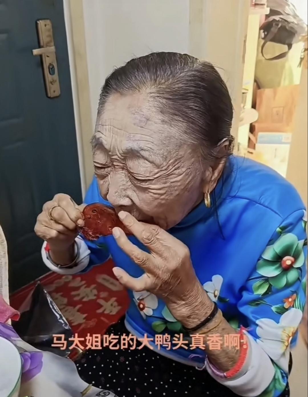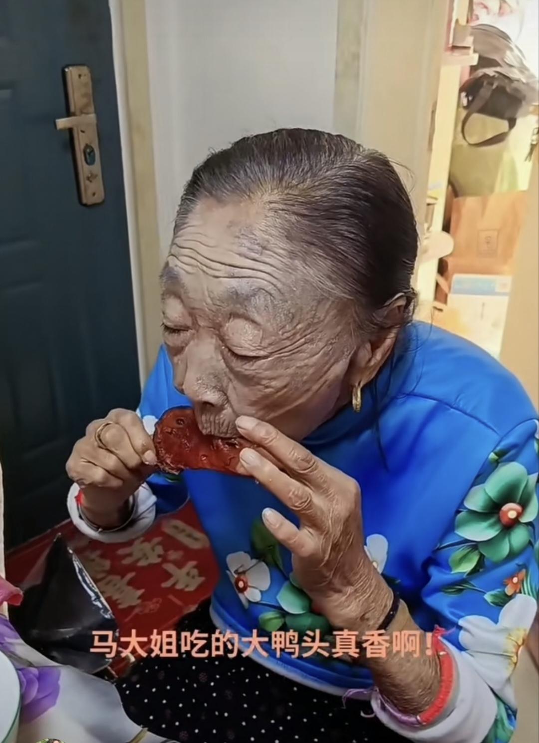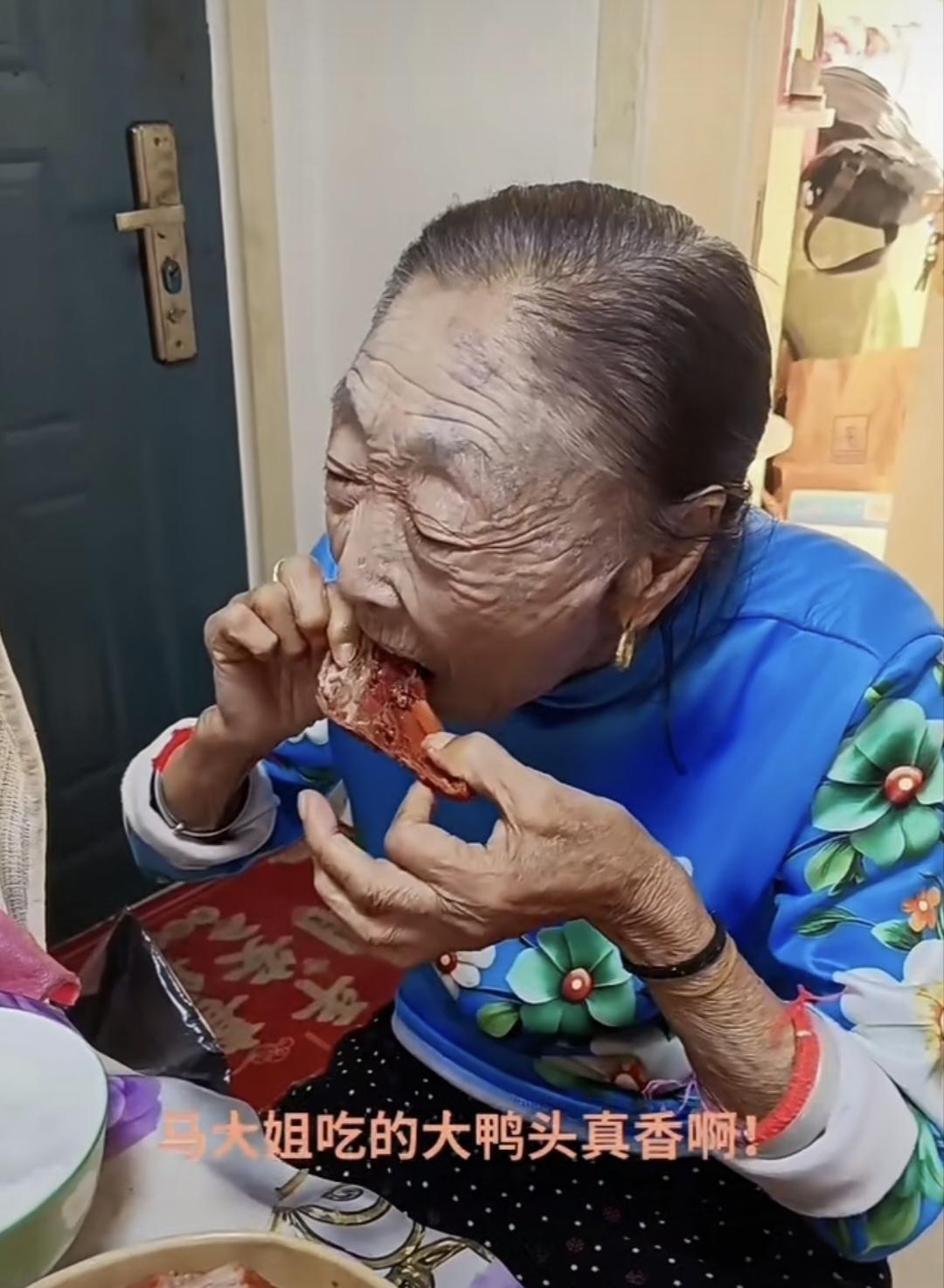 88岁的马玉琴吃大鸭头吃得是不亦乐乎啊!看看人家,即使是啃个鸭头打扮得也是齐齐整整,头发梳得光溜溜,天蓝色印花袄,黑底白圆点裤子,金银首饰也不少,妥妥的一位富裕老太太! 佩服马大姐的牙齿,居然还能啃鸭头呢。一边吃,还一边赞叹:好吃,太好吃了!怪不得马大姐身体好,人家是不忌口,啥都吃,这才营养全面呢。老了能吃也是事福分啊。能吃的人身体就是好!