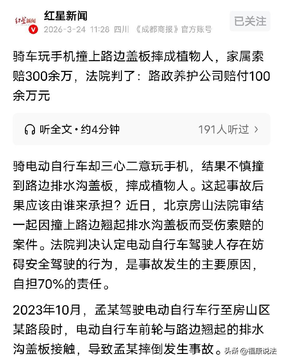北京,男子骑电动自行车撞上路边翘起的排水沟盖板,摔成植物人,家属起诉路政养护公司,索赔300多万,法院查明:男子骑车玩手机,是导致事故发生的主要原因,最后判决:路政养护公司赔付男子100余万。 2023年10月,孟某骑着电动自行车,经过一路段时,前轮猛地磕到了路边一处翘起的排水沟盖板,车身瞬间失去平衡,孟某突然失控整个人摔了出去,结结实实地砸在地面上。 这一摔,摔得他人事不省,被路人发现后紧急送医,可终究没能逃过厄运…… 司法鉴定显示,孟某脑子受了重伤,瘫痪了,手脚彻底动不了了,说话也说不出来,连自己翻身、吃饭都做不到,只能躺在床上躺着,全靠家里人和医护人员照顾,跟植物人差不多了。经鉴定他是一级伤残。 为了救治孟某,家人辗转多家医院,前后花了50多万元医疗费,后续的护理费、残疾辅助器具费更是像座大山,压得全家喘不过气。 思来想去,孟某家人觉得,事故是因为路边盖板翘起导致,便将负责该路段养护的路政养护公司告上法庭,索要300余万元赔偿,满心希望能有人为孟某的遭遇负责。 法庭上,双方各执一词。 路政养护公司认为: 第一,排水沟盖板本是用来排水的,不是给人走车的,盖板翘起藏在路边,不影响正常通行,自己没过错。 第二,是孟某自己违法驾驶,责任全在他,并拿出交通事故认定书作为证据。 没想到,法院查明的事实,竟让人无语。 原来,孟某正常应该在非机动车道骑车,可他倒好,却歪歪扭扭骑到了路边排水沟处,更关键的是,他全程没戴头盔,骑车时还玩手机。 他这样边看手机边骑车,肯定分散注意力,属于妨碍安全驾驶的行为,本身就极度危险。 法院认为,孟某自己要负主要责任。 大家都知道骑电动车要专心、要戴头盔,他倒好,一边骑车一边玩手机,这行为本身就很危险。 孟某把注意力放在手机上,没看到路边的盖板,才直接撞了上去。 《道路交通安全法实施条例》第72条:驾驶非机动车不得手中持物、不得分心影响安全驾驶。 如果,孟某能不玩手机、专心骑车、戴好头盔,这种情况很容易就能避开。 他自己不注意危险,肯定要承担大部分责任,法院判他承担70%的责任,是说得过去的。 但路政养护公司也不能完全撇清关系。 路边的排水沟盖板翘起来,很容易绊倒人,就是一个实实在在的安全隐患。 《民法典》第1256条:在公共道路上堆放、倾倒、遗撒妨碍通行的物品造成他人损害,公共道路管理人不能证明已尽清理、防护、警示义务的,应承担相应责任。 不管是排水用的,还是给行人走的,一条道路上出现这种“绊倒人”的设施,管理方就有责任及时处理。 如果他们及时排查、及时维修,孟某也未必会摔成这样。 他们的疏忽确实增加了事故风险,法院认定其承担30%责任,也算是情理之中。 最终,法院判决:路政养护公司赔付孟某100余万元。 有人说,在大街上经常能看到骑车玩手机的,看着是很危险的,随时可能摔。 这个结果看似平衡,却让人唏嘘不已。 孟某一时的侥幸和疏忽,不仅让自己落得终身瘫痪的下场,也让整个家庭陷入困境;而路政养护公司的履职不到位,也终究要为自己的疏忽买单。 骑电动车看似轻松,实则容不得半点马虎,不戴头盔、骑车玩手机这些看似不起眼的小事,稍不注意就可能酿成大祸,所以,骑车要注意安全,不能玩手机,因为,安全无小事,一念之差,可能就是一生的遗憾。