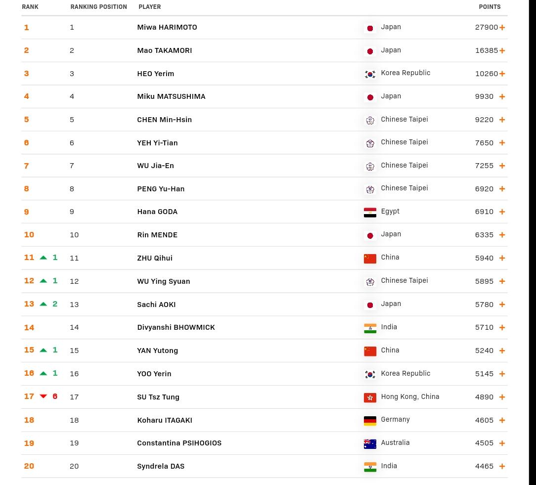 这是本周公布的u19世界排名表。 男单排名首位的是松岛辉空,前10名里国乒只有温瑞博一人。 女单排名首位的是张本美和,国乒祝启慧排名第11位。 对这个排名表,个人觉得不要过度去解读。 因为国青总体参加WTT青少年系列赛的次数很少。 国青教练为什么不热心这些赛事?主要是这样的比赛奖金很低,且竞技水平并不高,大老远跑去劳师远征往往收获并不大,还不如在国内训练收获更大些。 所以国青采取的办法是只挑一些重点青少年球星挑战赛参加,拿到世界青年锦标赛的参赛名额即可。 所以国乒u19的排名相对靠后是因为很多比赛都放弃了。 至于像日韩主要是他们的一些年轻选手参赛频次较高,如张本美和、松岛辉空等一直是在打成人赛,所以他们的u19排名构成里成人赛占的比例比较高,名列前茅很自然。 排名高低是要看参赛次数和成绩这两个相关因素。 毕竟u19排名只是一个参考值,国青这样的参赛考量当然有他们的专业判断,如果在青年世锦赛等比赛里成绩突出,就可以参成人级别的赛事,冒出头来,相信国青队有这个实力。