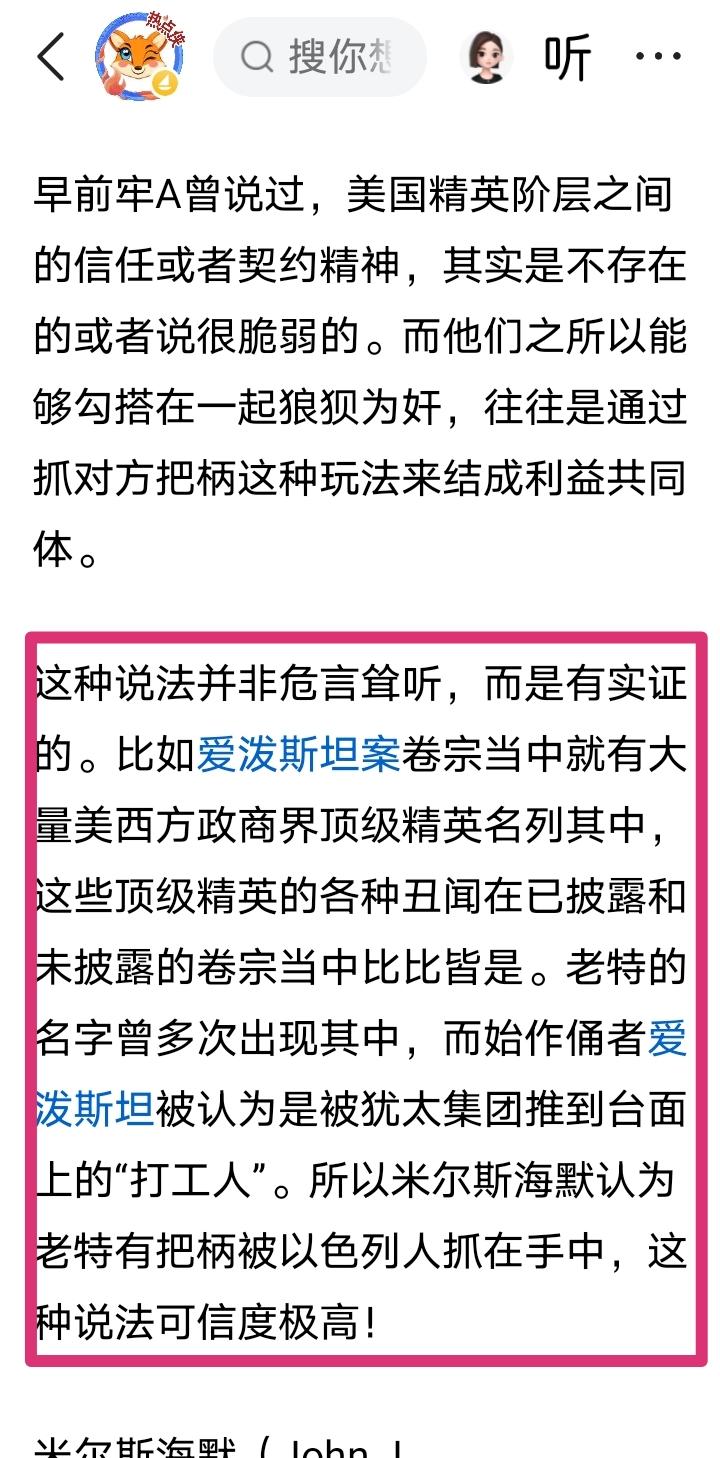 看来老特是真的被内塔尼亚胡拿捏了!3月21日我曾写过一篇贴文认为老特有把柄被以色列人抓在手中,这种说法可信度极高! 当时是美国学界大佬米尔斯海默向记者爆出来了,不过他也表示手上没有直接证据,只是猜测和推断。 而今天(3月24日)美国前国务卿布林肯也站出来发声了(见附图一),并且直接表明是内塔尼亚胡拿了老特跟爱泼斯坦的通话录音来要挟老特就范,配合他对伊朗动武。这也恰好证明我上一篇贴文的分析是正确的。(详见附图二)