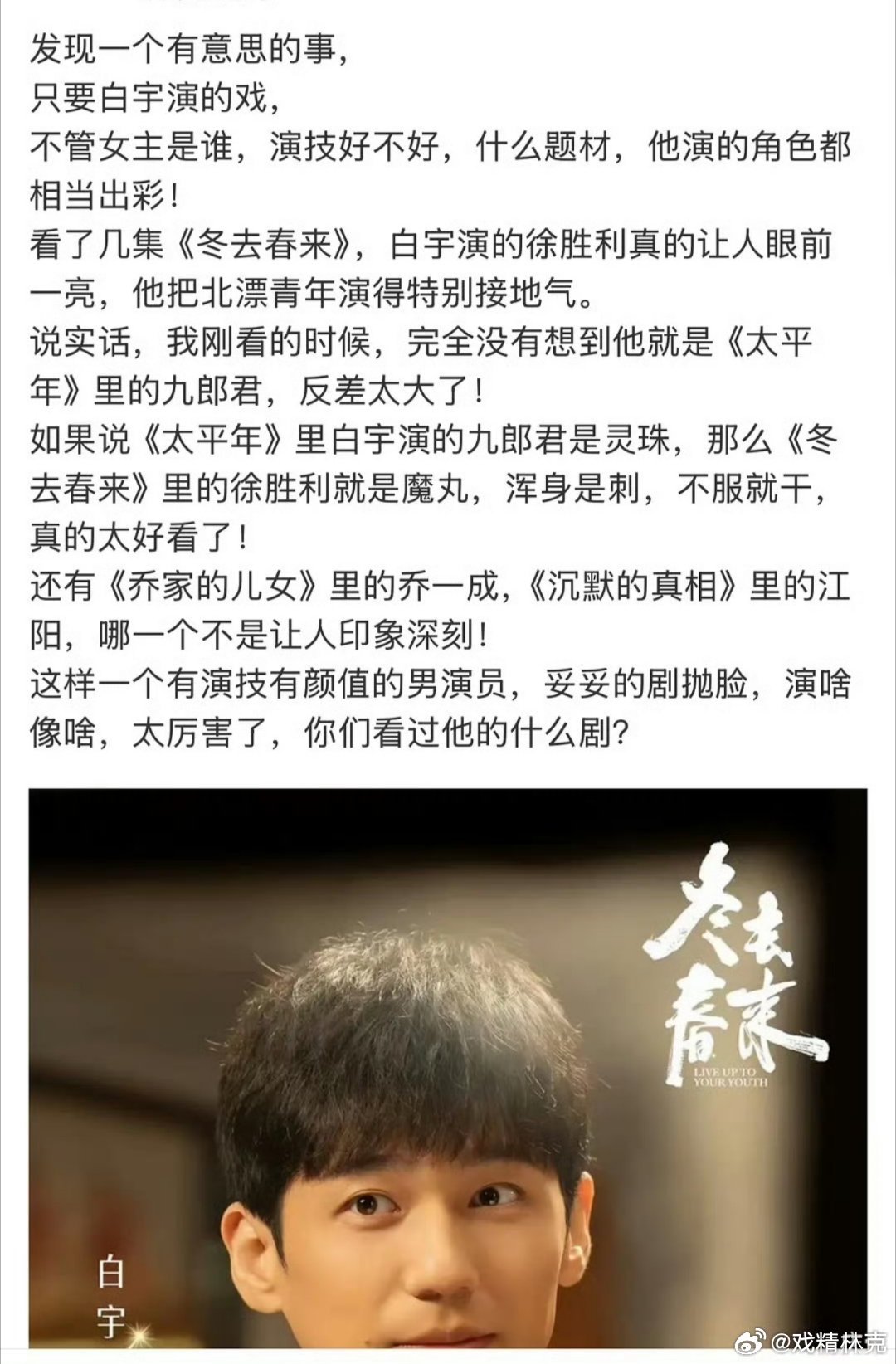 熬夜看完白宇章若楠的年代剧《冬去春来》,觉得是最近年代剧最佳,结果网上一片差