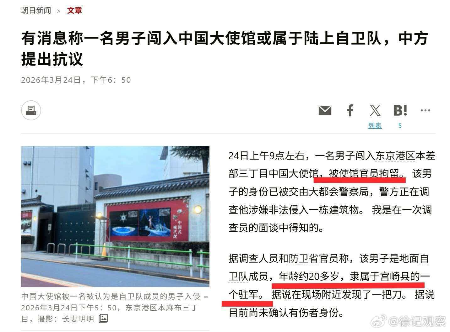 日本自卫队人员翻墙进入,手持刀具。有日本媒体报道,目前人员被大使馆工作人员制服了拘留。没有把人交还给日本警方。只是通报了身份给日本警方。此人身上有自卫队官方ID卡。不知道是哪位汉使制服这个右翼疯子。一日本人威胁要杀中国外交人员