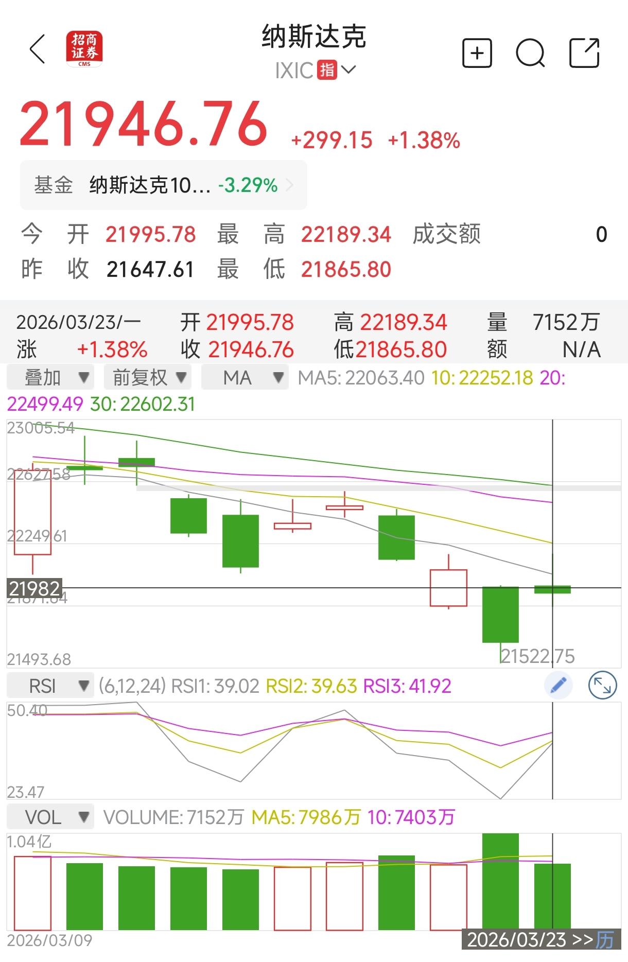 英伟达股价上涨1.7%,苹果股价上涨1.4%,特斯拉股价上涨3.5%,阿里巴巴上涨2.98%……美股科技股普涨,引领美国三大指数戏剧性反转,同时国际原油价格大跌10%,能否带动A股行情反转? 3月23日美股上演反转,受特朗普宣称美伊对话“富有成效”影响,市场对中东局势的担忧大幅缓解,美股三大股指都走出涨超1%的行情:纳斯达克+1.38%,道琼斯+1.38%,标普500指数+1.15%,此前飙升的国际油价暴跌超10%。 ●美股知名科技公司股价涨幅: 英伟达, 1.70% 苹果公司,1.41% 谷歌A, 0.35% 微软公司,0.30% 亚马逊, 2.32% 台积电, 2.80% Meta公司,1.75% 博通公司, 4.08% 特斯拉, 3.50% 思科公司, 1.51% 阿里巴巴, 2.98% 希望A股24日能够强力反转,祝读友发财。美股 美股大盘指数 英伟达