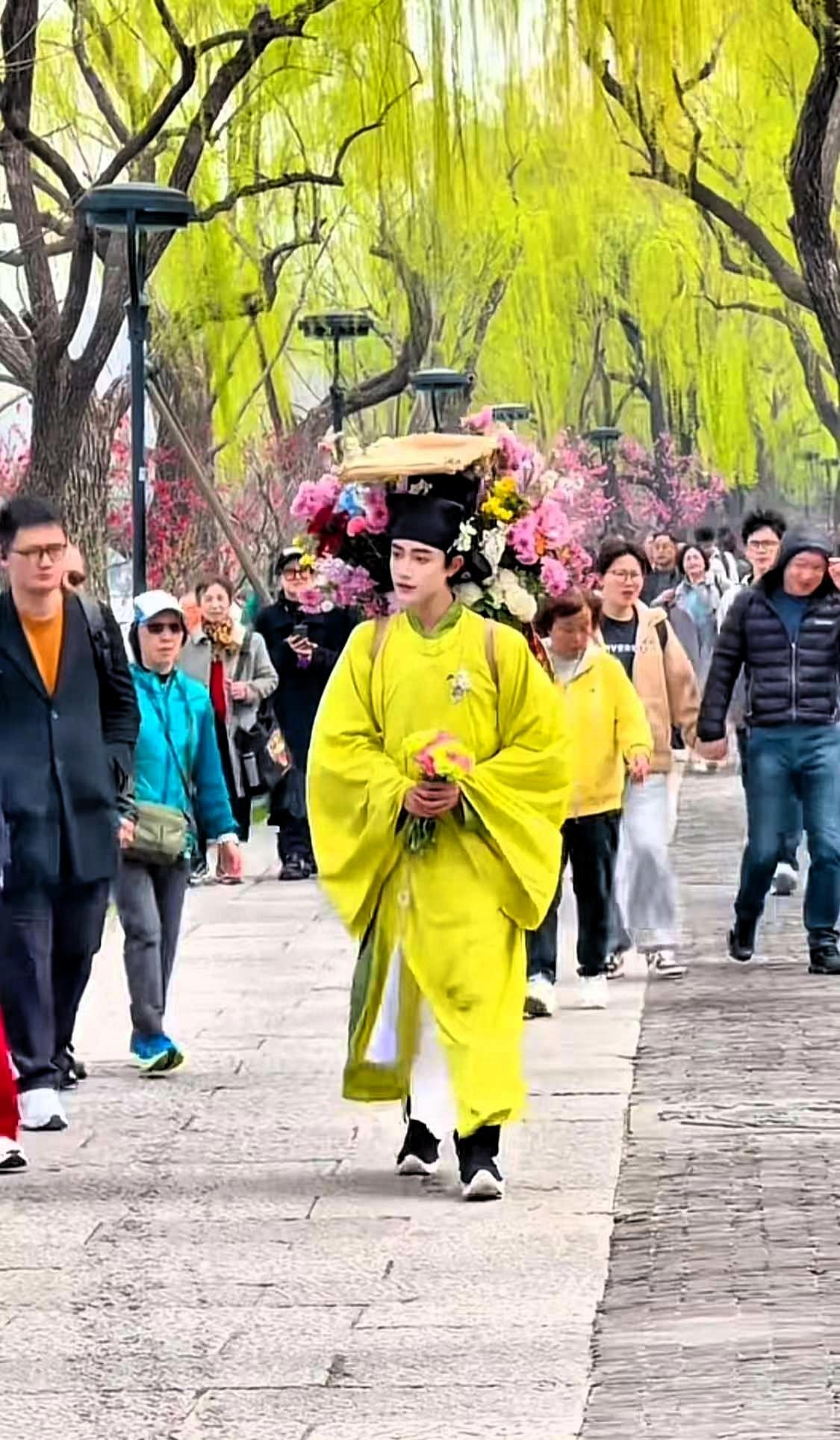 西湖卖花郎 这哪是卖花郎,这是从《清明上河图》里走出来的春日限定美男!” 不是簪花美,美在簪花郎,鬓边藏春色,眼底有星光。风过花微动,衣袂带清香,不必追光,你自发光,把浪漫簪进岁月,把温柔藏进日常,走过四季皆是好风光。 近日,西湖边身着汉服的卖花郎受到不少关注,他挑着花担行走湖畔,簪花于鬓,举止清雅,与西湖的景致相融,成为春日里一道独特的风景。这种形象并非凭空而来,而是借鉴了宋代男子簪花的传统习俗,让古典审美以生活化的方式重现。 卖花郎的走红,本质上是大众对自然、雅致生活的向往。在快节奏的当下,人们渴望从日常中寻得一份松弛与美好,而他所呈现的,正是不刻意的诗意。没有过度包装,没有刻意营销,只是将传统服饰、簪花习俗与卖花的日常结合,便打动了许多人。 这也让我们看到,传统文化的传承不必高高在上,融入生活才更有生命力。宋代的簪花雅俗共赏,如今在西湖边重现,既是对传统的致敬,也是对当下生活的点缀。年轻人以温和的方式演绎传统,让古典审美变得亲切可感,这是文化自信的自然流露。 一束鲜花,一身汉服,一步一景,把春日的温柔与生活的浪漫传递给路人。这样的美好,简单而珍贵,也让更多人感受到传统文化的温度。