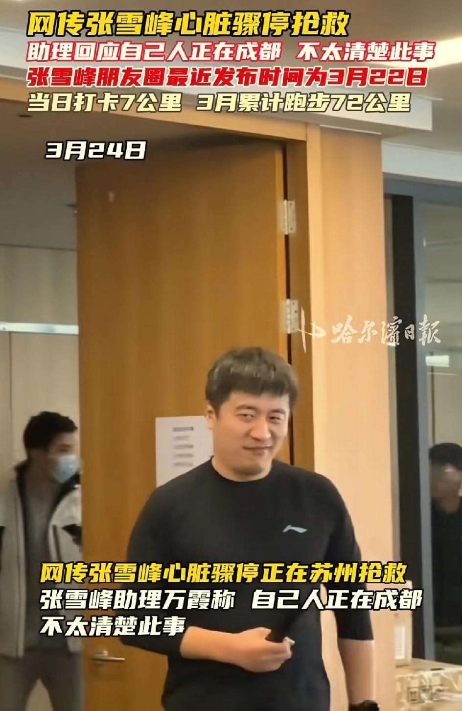 张雪峰在2023年的时候因为心悸住院。今天是2026年3月24日,网传他在苏州抢救。他的合伙人说无可奉告,他的经纪人万霞,说自己人在成都,不太清楚此事。最后一张朋友圈是3月22号跑步打卡。他经常直播下了播之后还会去跑步。应该也是很注重劳逸结合的,但是能者多劳,精气神消耗的也多。